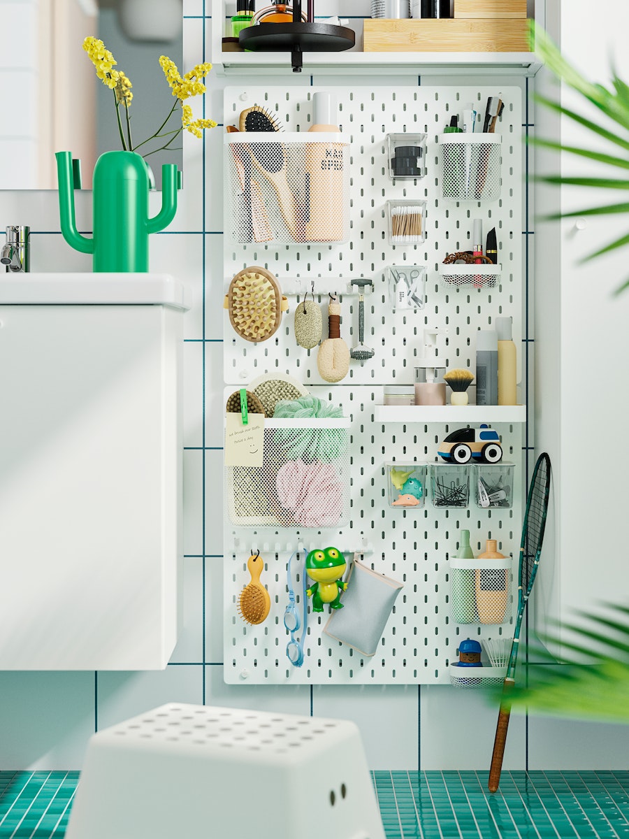 Kid’s stuff? On the bottom. Shaving creme? Sorted higher up. Seeing all the small stuff organised in the right height like this makes every day a little happier and morning routines a lot smoother. With customisable storage add-ons, SKÅDIS pegboard makes thing easy to find, and easy to put back.