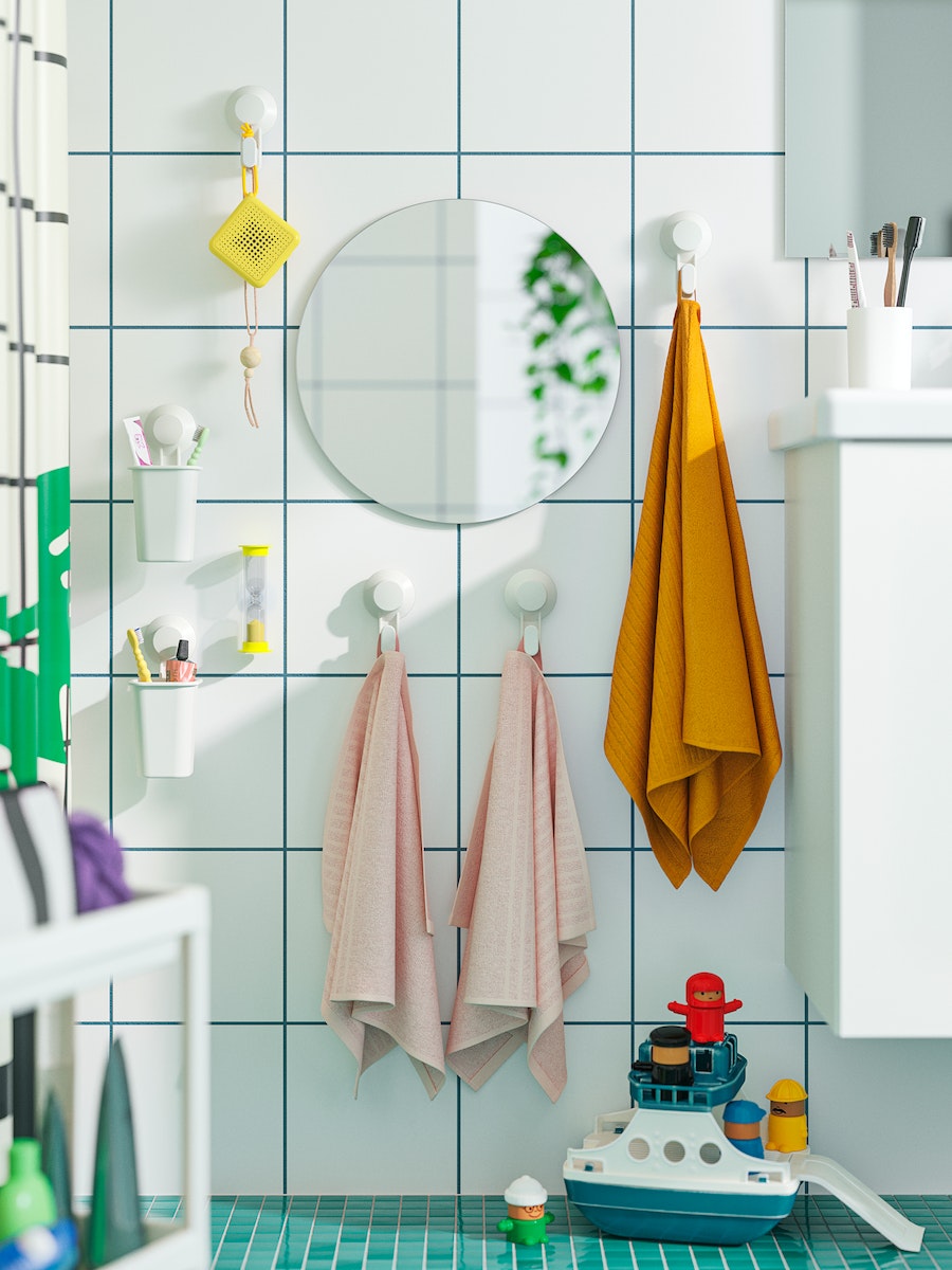 Put up a playful wall. Hooks and baskets with a suction cup are easy to arrange so even the youngest ones can reach for a towel, and perfect to move around when your kids grow. Also, it’s always helpful to mount a mirror at a lower height so everyone can see themselves without help.