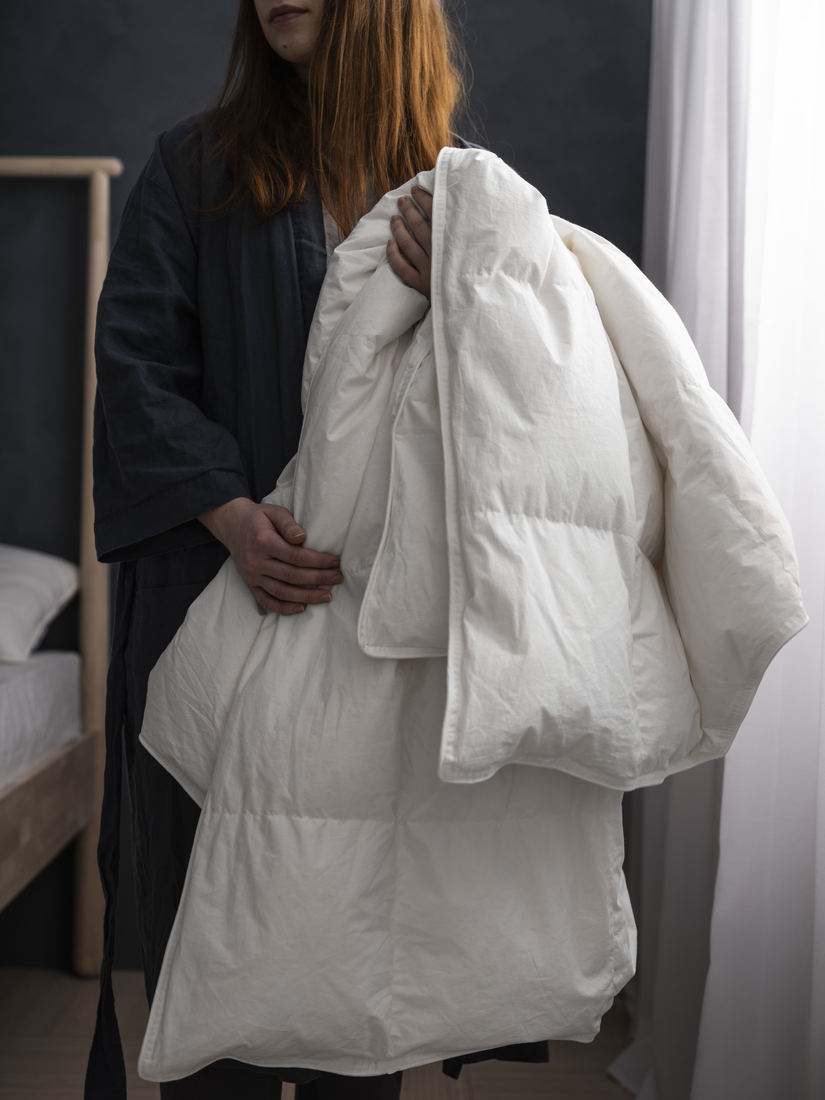 Duvets made with natural materials, such as down, feathers, or wool, offer an effective way to regulate sleep temperature. These materials are known for their breathability and moisture-wicking properties, which help maintain a comfortable warmth throughout the night. Also, they are easy to care for and machine-washable.