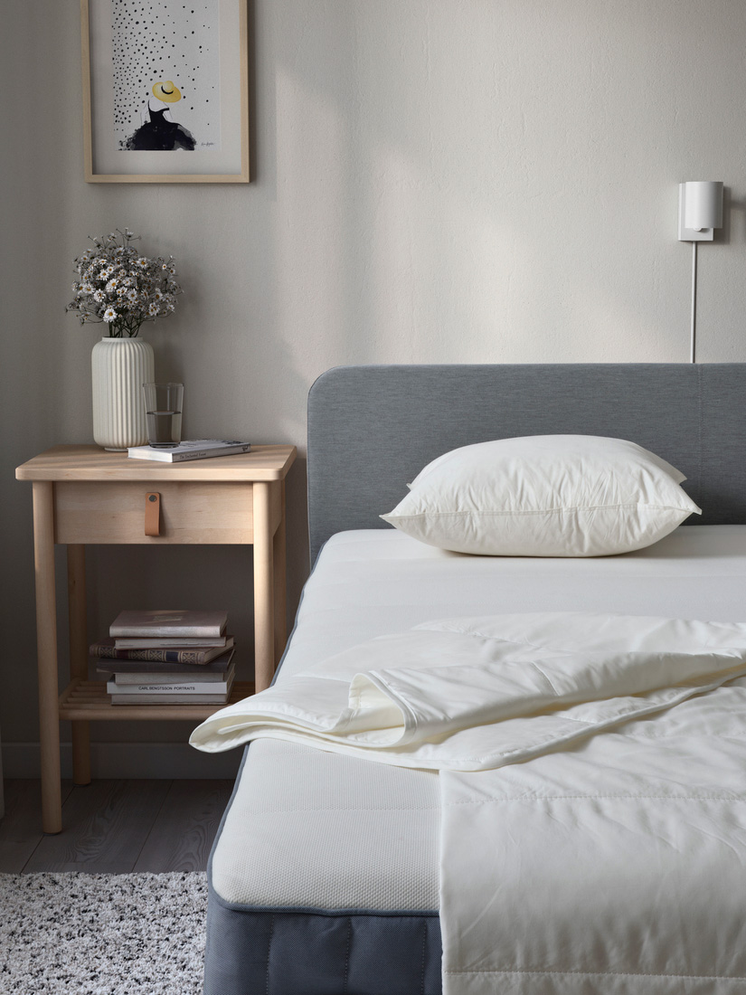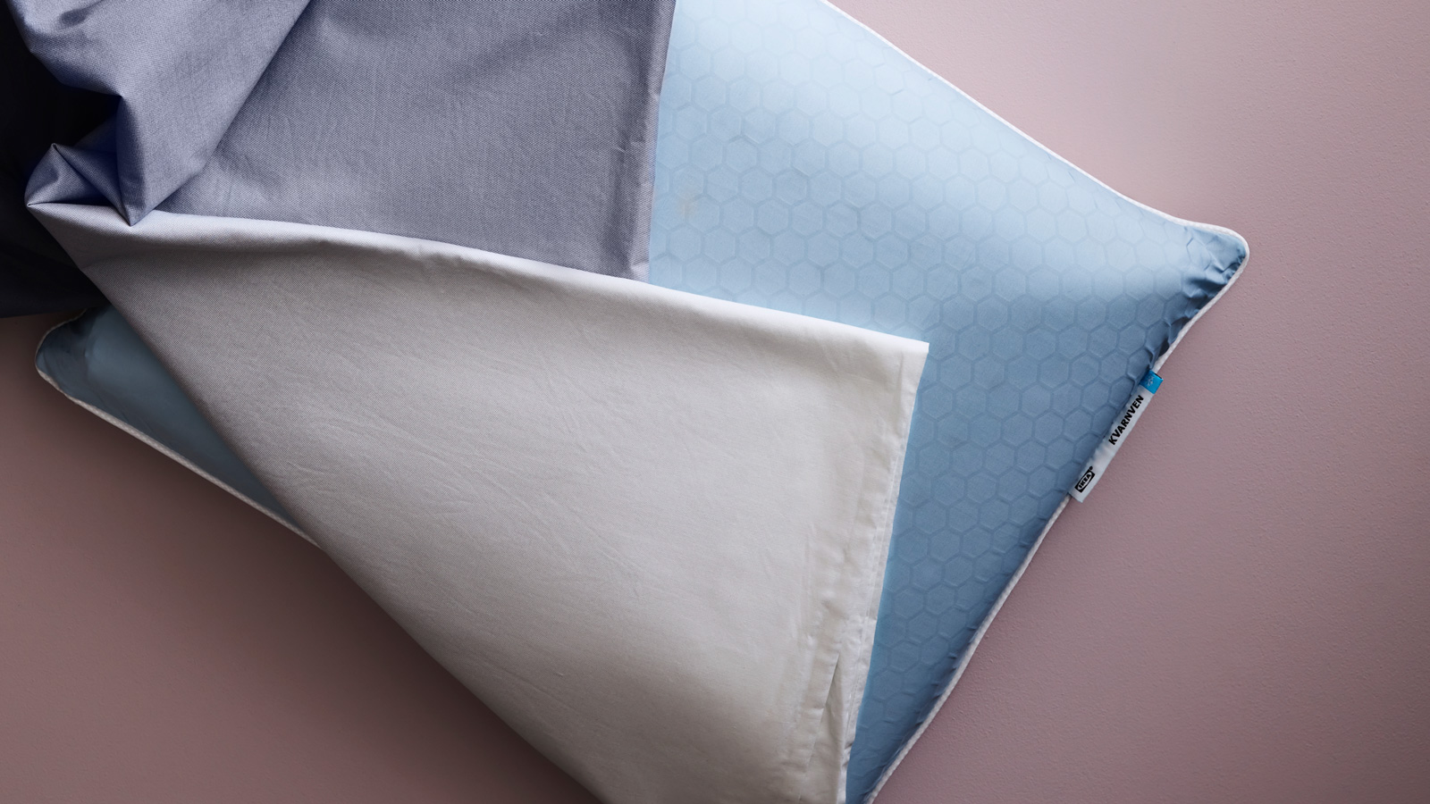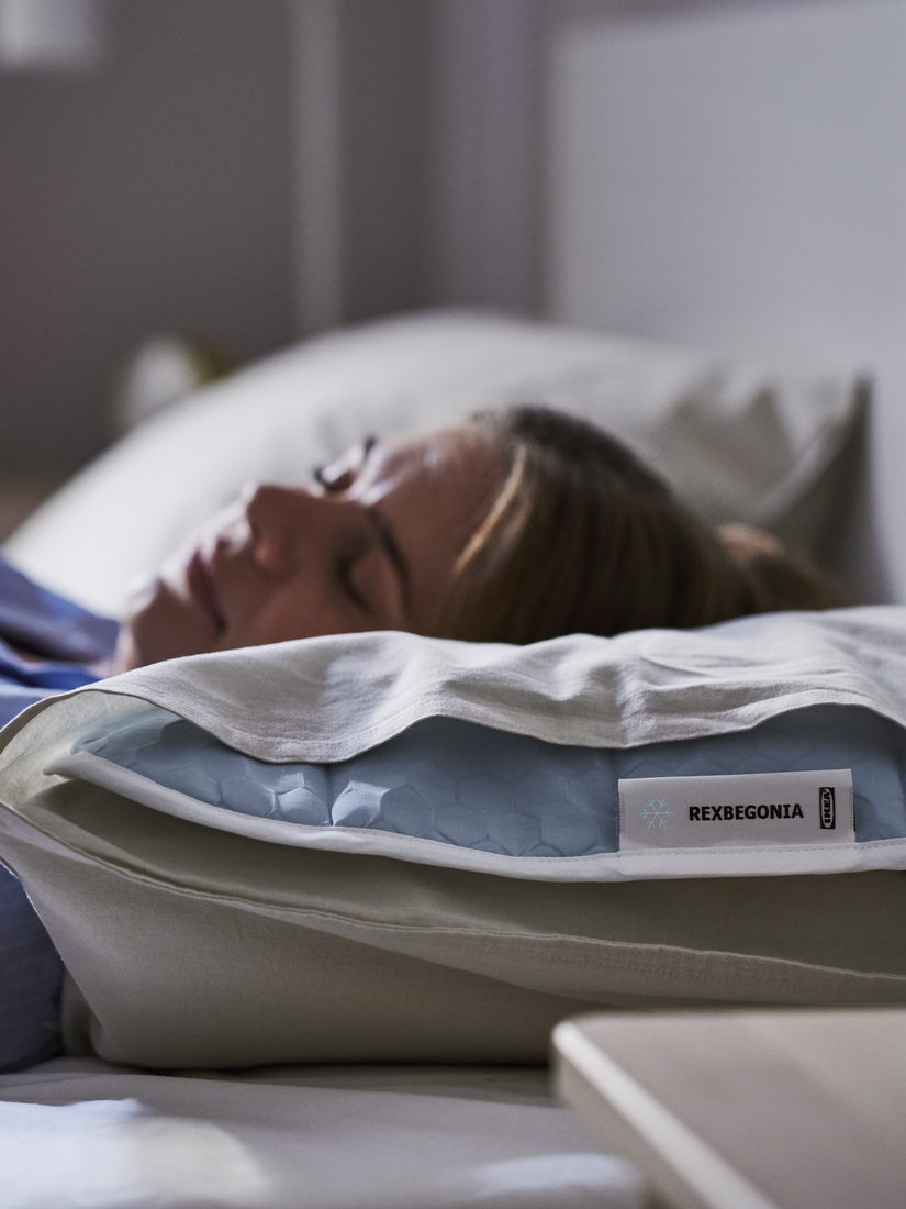 Struggling with night sweats? Discover dry and undisturbed sleep with the KVARNVEN ergonomic pillow. The pillow’s ice-blue side brings a refreshing coolness, making hot nights more bearable, while at the same time shaping itself to your head, providing effective stress relief. It’s available in multiple heights, so that side, back, and stomach sleepers all find their perfect match for optimum comfort and support.