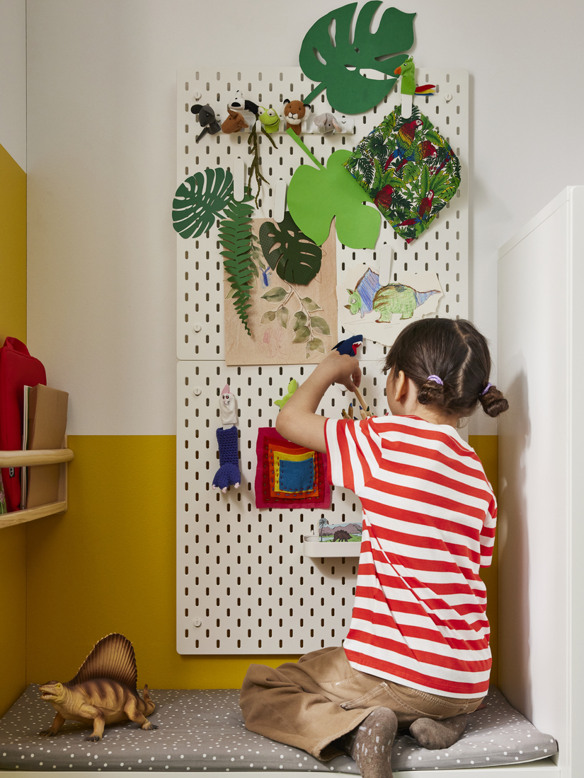 When planning a children’s room, don’t overlook the little ones who actually live in there. The children know what they need space for, how they prefer to both wake up, play all day and last but not least; comfortably fall asleep at night. Make planning their room your mutual project, and why not use SKÅDIS pegboard as a canvas for all the different ideas? With a pegboard and creative minds, nothing is impossible.