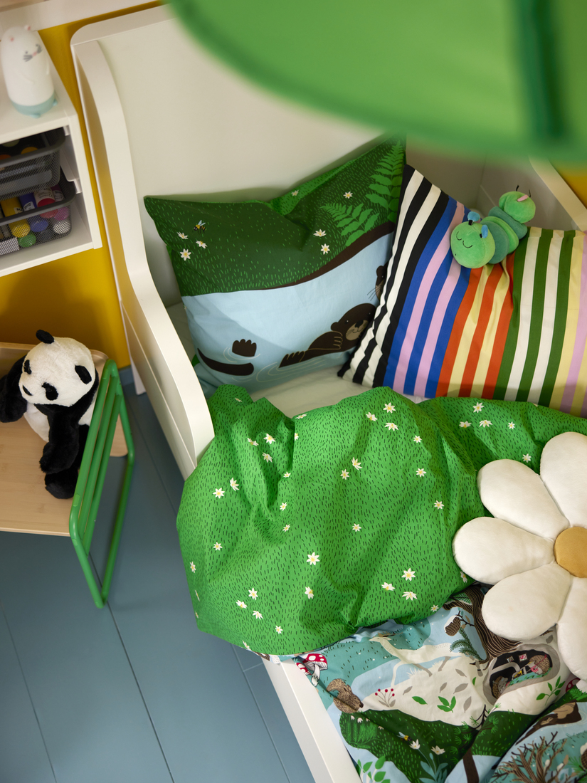 Children’s beds should be places they long to curl into, and having their own favourite bedding makes it easy to come to rest at night. As they grow the snuff blanket might be traded for a dinosaur or book, but if you choose an extendable bed and adaptable storage solution, the furniture last for many years to come!