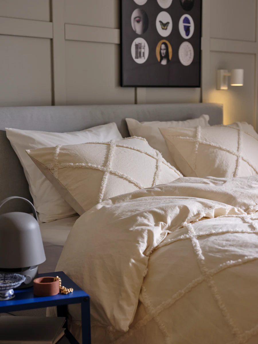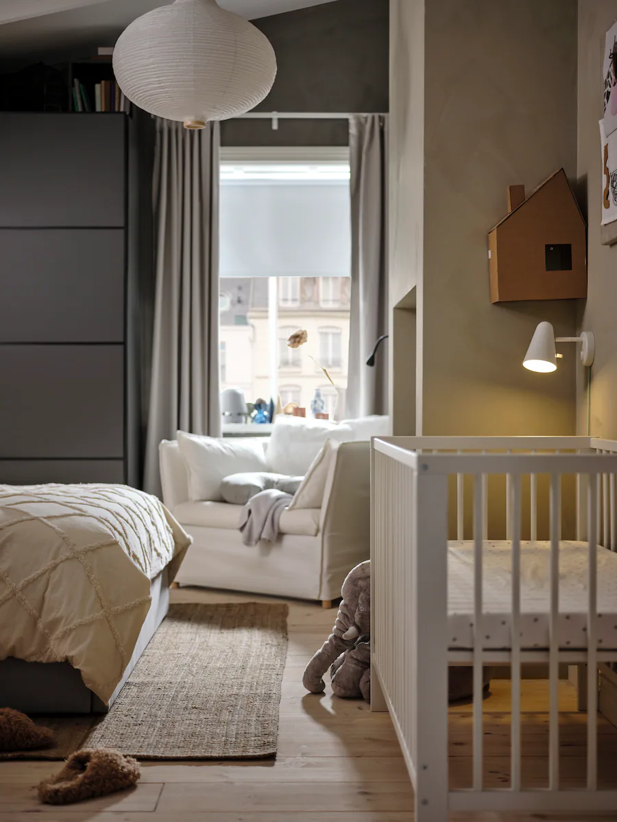 This bedroom is as much for you as for your baby, so make sure to create an inspiring, tranquil space for me-time. Transform the bed with cushions in soft-toned colours and tactile textiles in neutrals. Against the calm grey, they will set such a peaceful vibe that you might find everyone else wants in too.