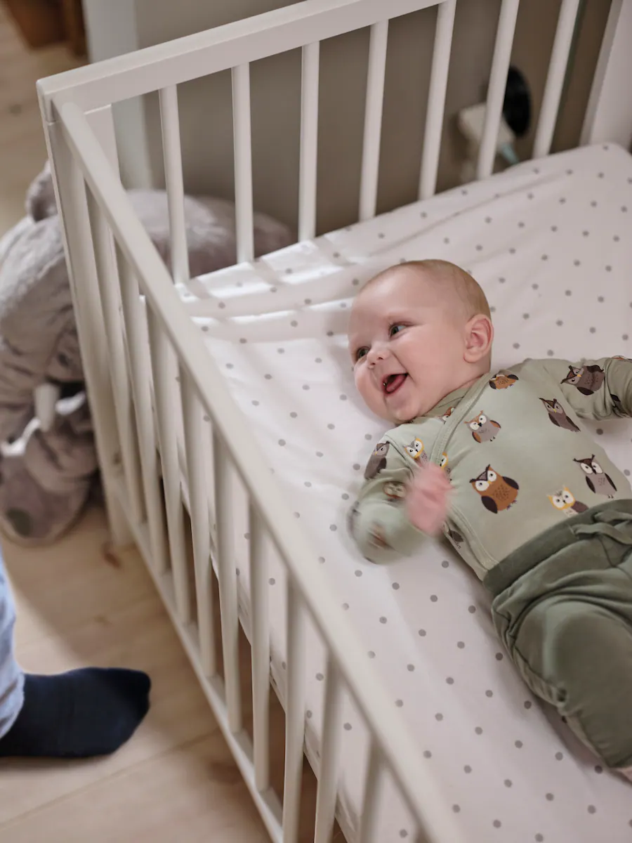 Try placing baby’s crib near your bed so you can keep an eye on them without getting up. The safest position for the crib is against a wall, away from a window with curtains or blinds, and with no plug points or heaters nearby. Crib sheets made from soft 100% cotton are all they need for complete sleep comfort.