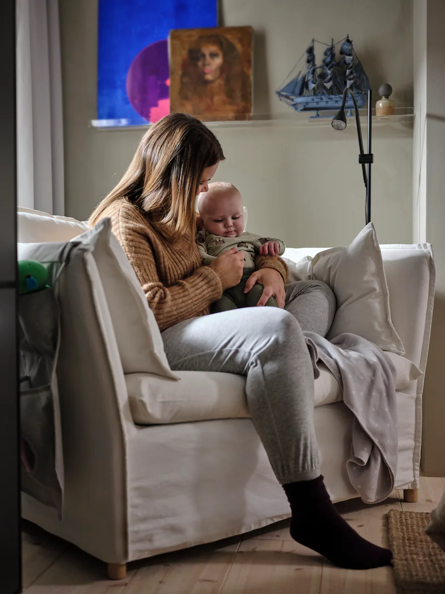 Create a sanctuary area for things like nursing, napping, or chilling out with your baby. The two of you can easily cosy-up in this spacious armchair – simply add smart storage to keep essentials handy. A comfort tip? Try a nursing pillow to support baby’s body and boost the feeling of warmth and security.