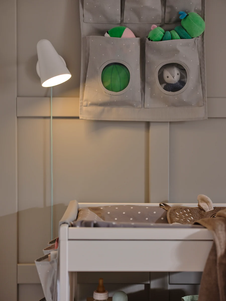 A mix of lighting will help add depth and atmosphere to the space, and direct light where you want it to be. It lets you customise the lighting for different moods or activities. Try a small dimmable lamp by the changing area to keep things sleepy during night changes so you can all easily settle afterwards.