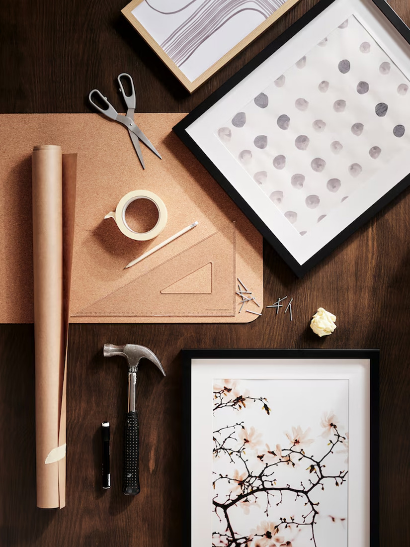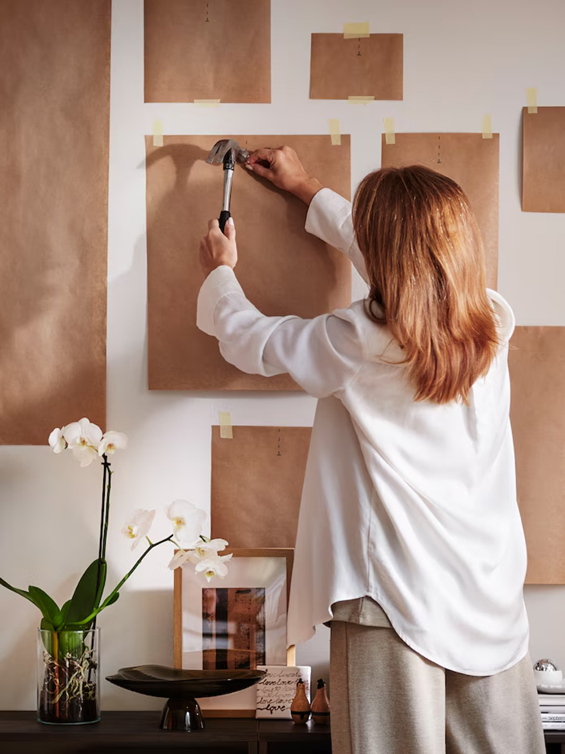 Next is finding a configuration that you like. If you want, start by trying different layouts on the floor, as it’s easier to move things around. When you’ve found a nice balance and have the templates taped to the wall, mount hooks or nails at your marks, through the paper.