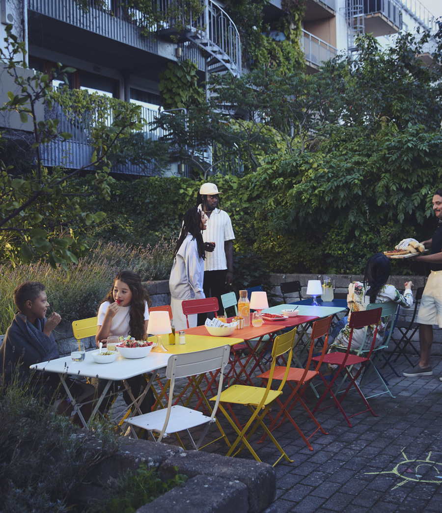 Bring down the tables and good vibes to the courtyard and get to know your neighbours. With SUNDSÖ outdoor furniture, you’re always ready for a summer party. As the sun sets, brighten the evening with your favourite colour.
