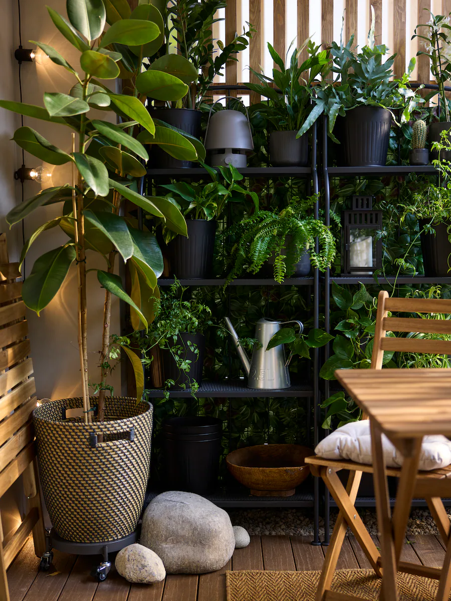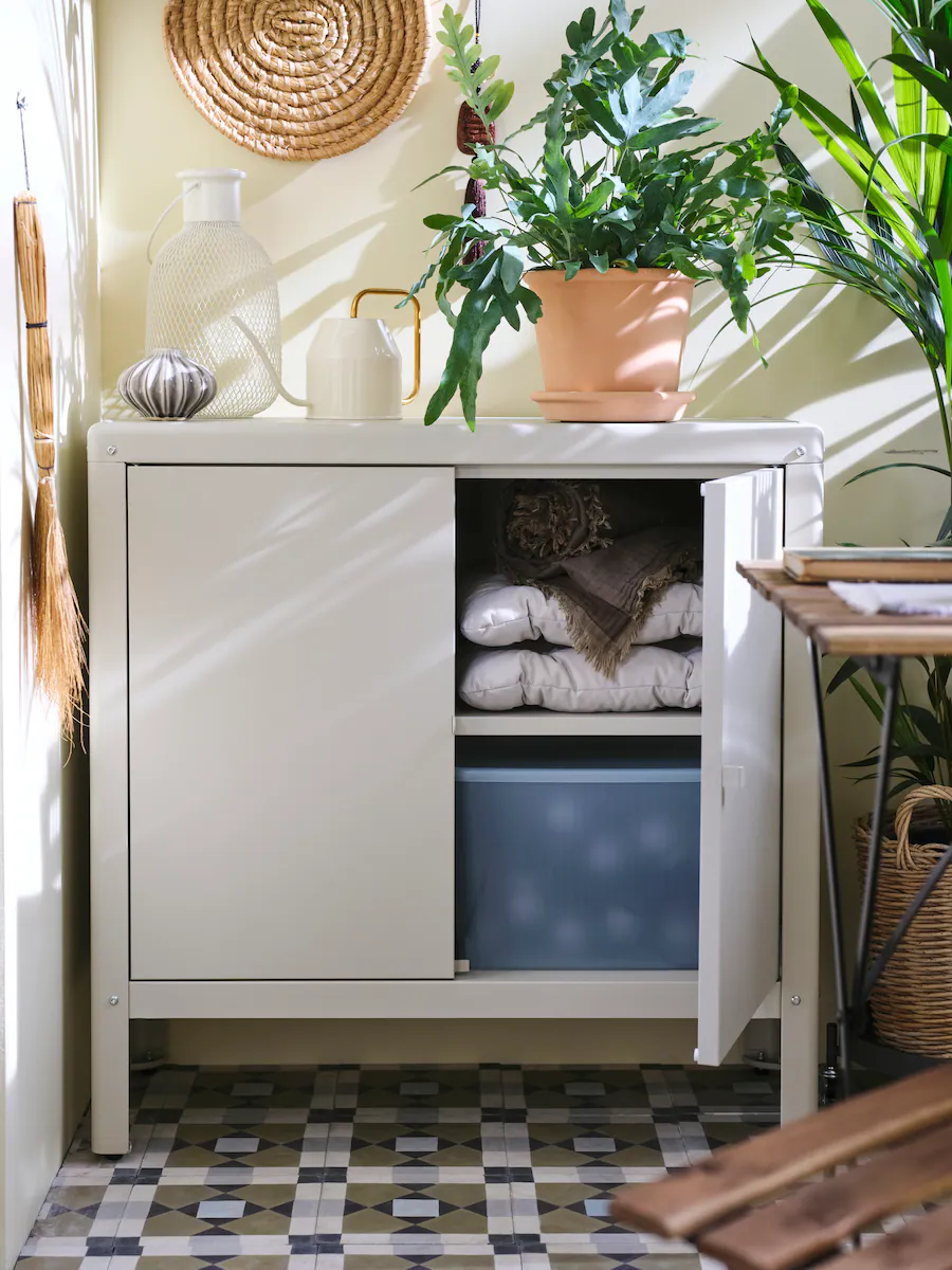 Give greenery spacious, sturdy storage. Go for metal or plastic-coated metals that can handle wet areas. Open shelves or cabinets have room for pots, watering cans and gardening tools. Plus, they keep mess-prone bags of soil off the floor. Pots that match your shelving will put your plant babies in the spotlight.