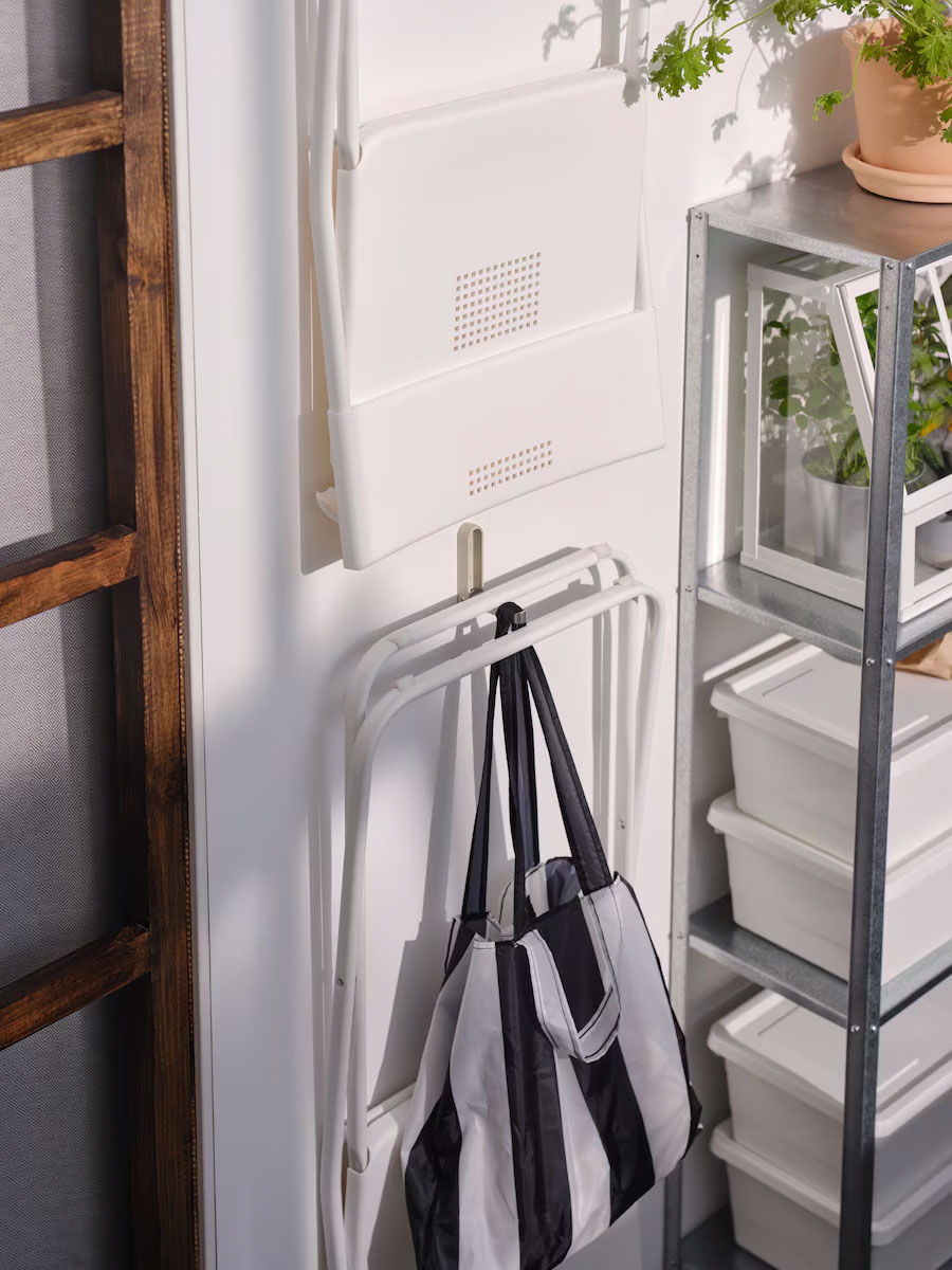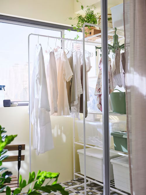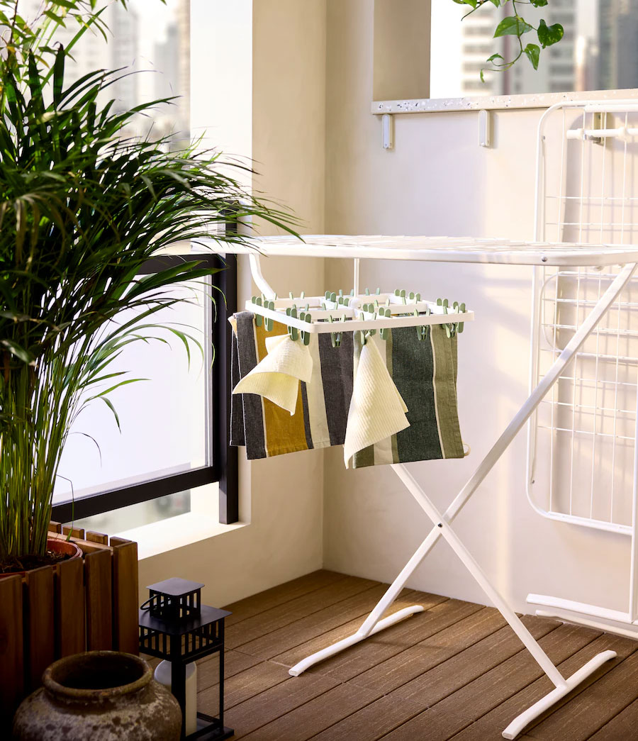 Practical. Nearly invisible. Those are key phrases for laundry/drying balcony storage ideas, especially in small areas. Like foldable drying racks that can hang out of the way when not in use. Or wall-mounted clothes bars that blend in. A shelving unit is a handy home for soaps, sprays, laundry bins and hanging dryers.