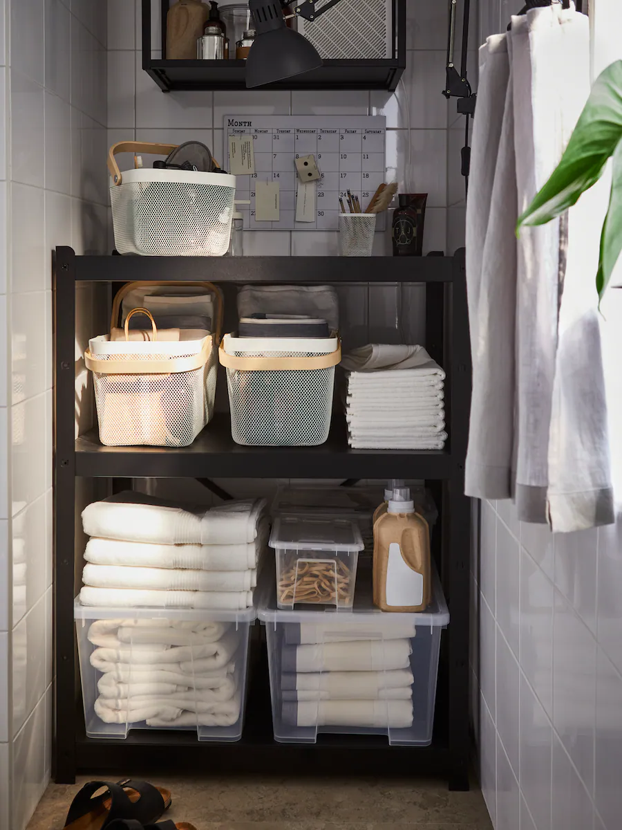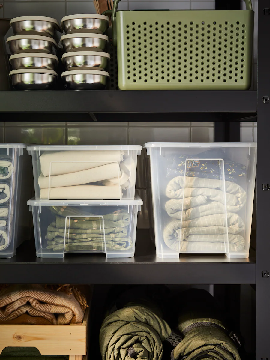 Shelves that reach up high will give you lots of storage space. Put heavier things lower down to avoid straining yourself with lifting. Boxes make it easy to gather together and organise stuff. Transparent ones mean you always know what’s inside and boxes with lids keep out dust.