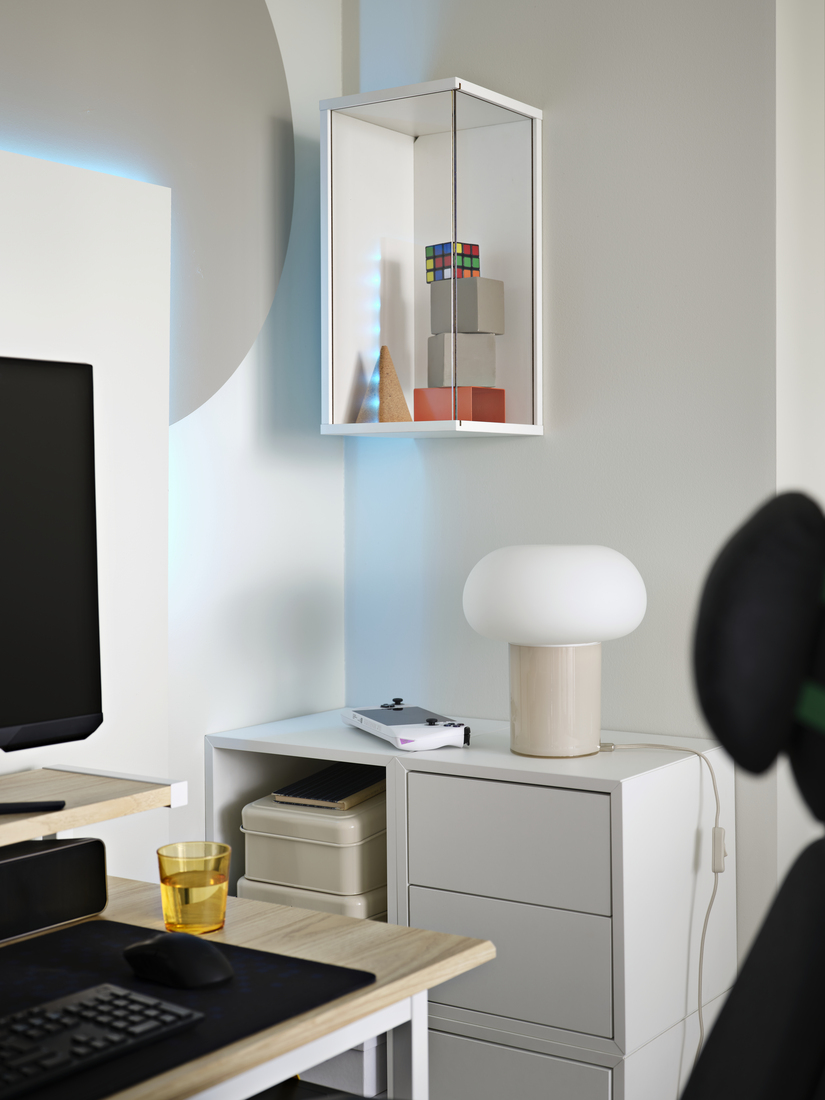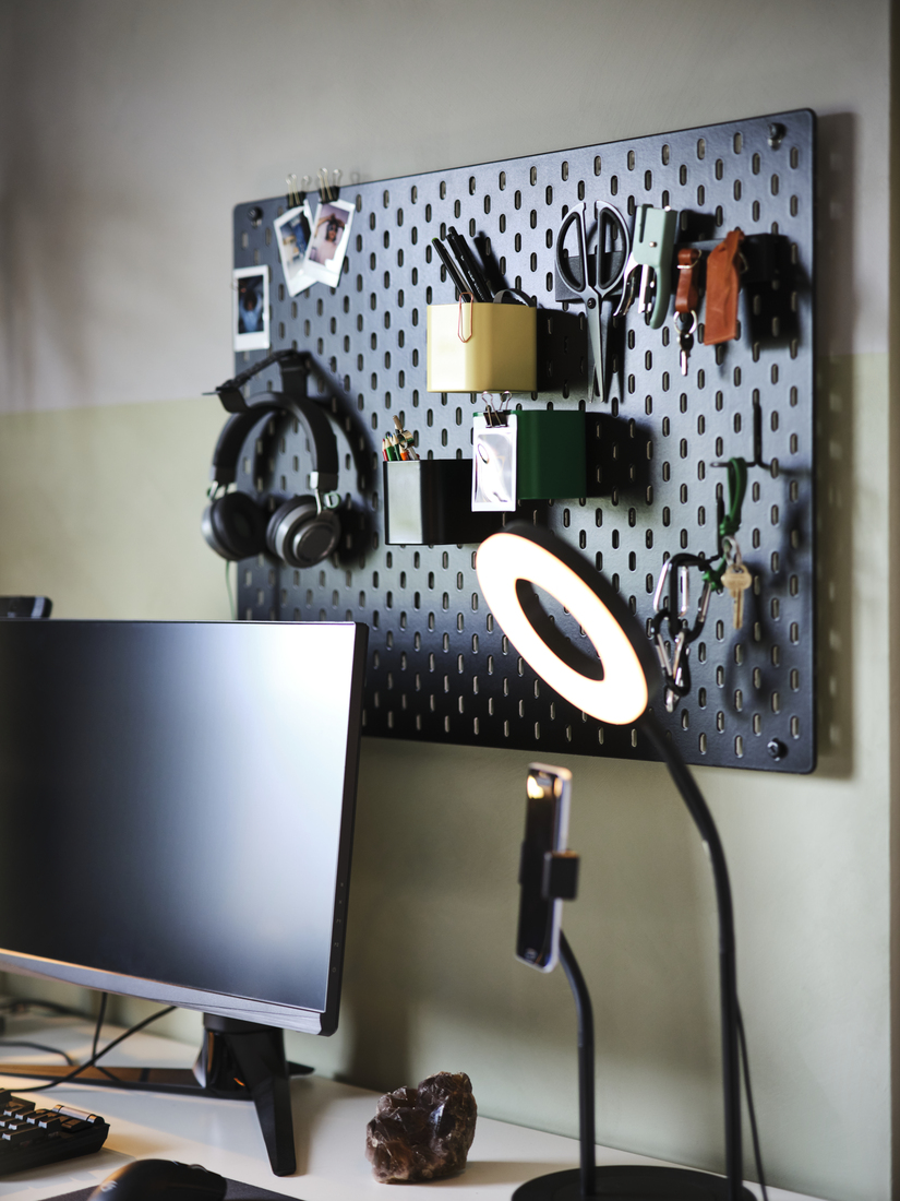 Place minifigures, deluxe editions, DIY creations (aka your real-life loot) in display cabinets above and around your setup so they’re easy to adore, yet safely out of the way from sneak attacks. For items you want handy (air dusters, batteries) and/or definitely shown off (keycaps), use pegboards or open wall storage.