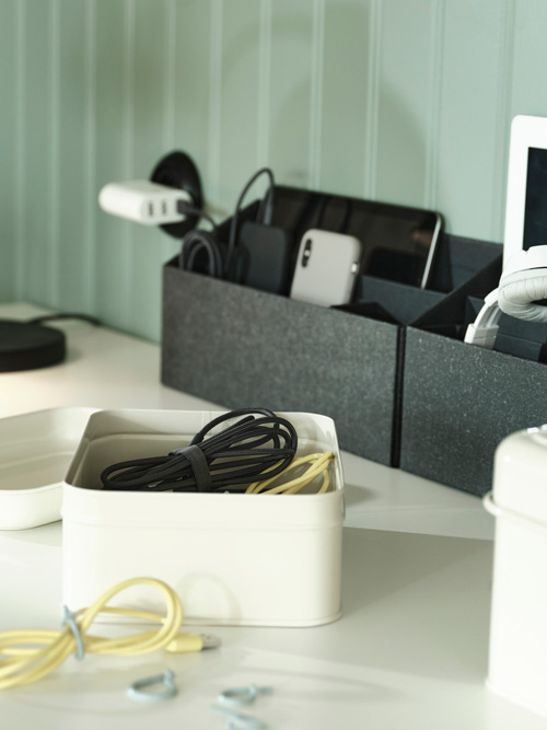 Mess can add to stress and steal focus. Cable management is key. Flexible, reusable ties keep wires neatly sorted and bundled. Clips, holders and boxes ensure cords stay in place – and out of sight, if you want. Trays attach onto desktops for easy access tidiness that doesn’t disturb.