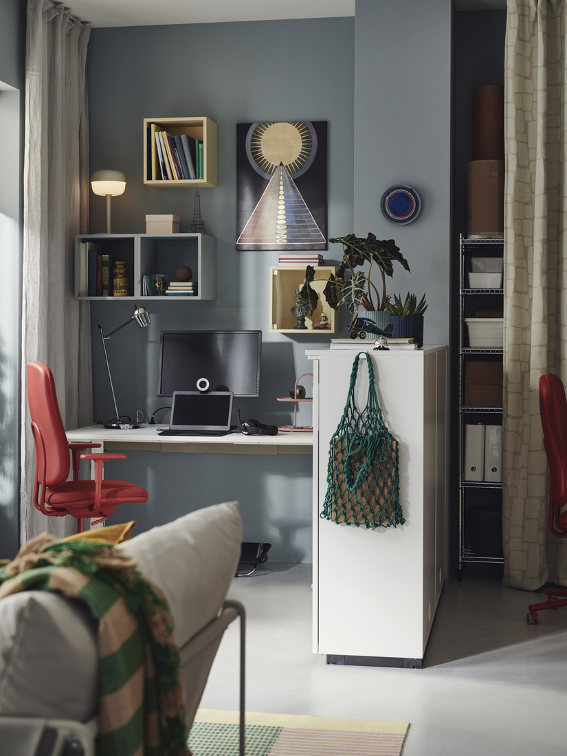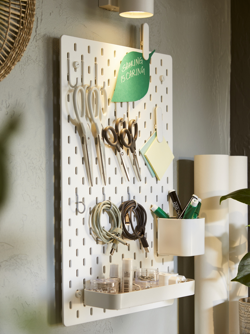 A multitasking SKÅDIS pegboard on the wall can be decorative and functional, whether there’s a need (and room) for just one or several side by side. Customise with accessories like clips, hooks, shelves, containers and baskets for out-in-the-open, out-of-the-way order. Can a pegboard be employee of the month?