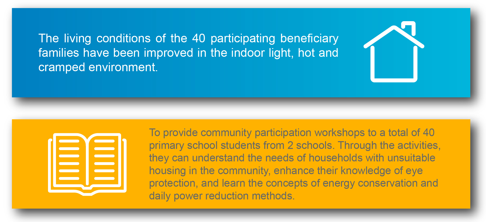 As Hong Kong families suffer from energy poverty, it seems to be a dream for them to have a good quality of life. Many families do not have the resources to improve the quality of life for their children and themselves. The project aims to solve their energy poverty problem, improve children's learning and playing environment, improve their quality of life, and inject hope into their lives. Therefore, IKEA and Caritas worked together to design four major projects - material donation, educational workshops, family visits and community education - the above goals should not only solve the short-term living difficulties of the beneficiary families, but also help them improve their ability to face energy poverty in the long term, as listed below: