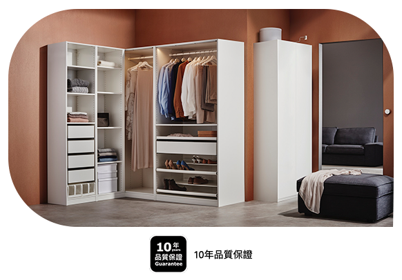 PAX衣櫃系列有多款尺寸和內部配件因應你的需求、喜好搭配,更有效收納衫、褲、絲巾和貼身衣物等。 不只這樣, PAX衣櫃系列板材嚴控甲醛含量合乎歐盟最高規範E1標準,給你和你心愛衣物最安全的家!