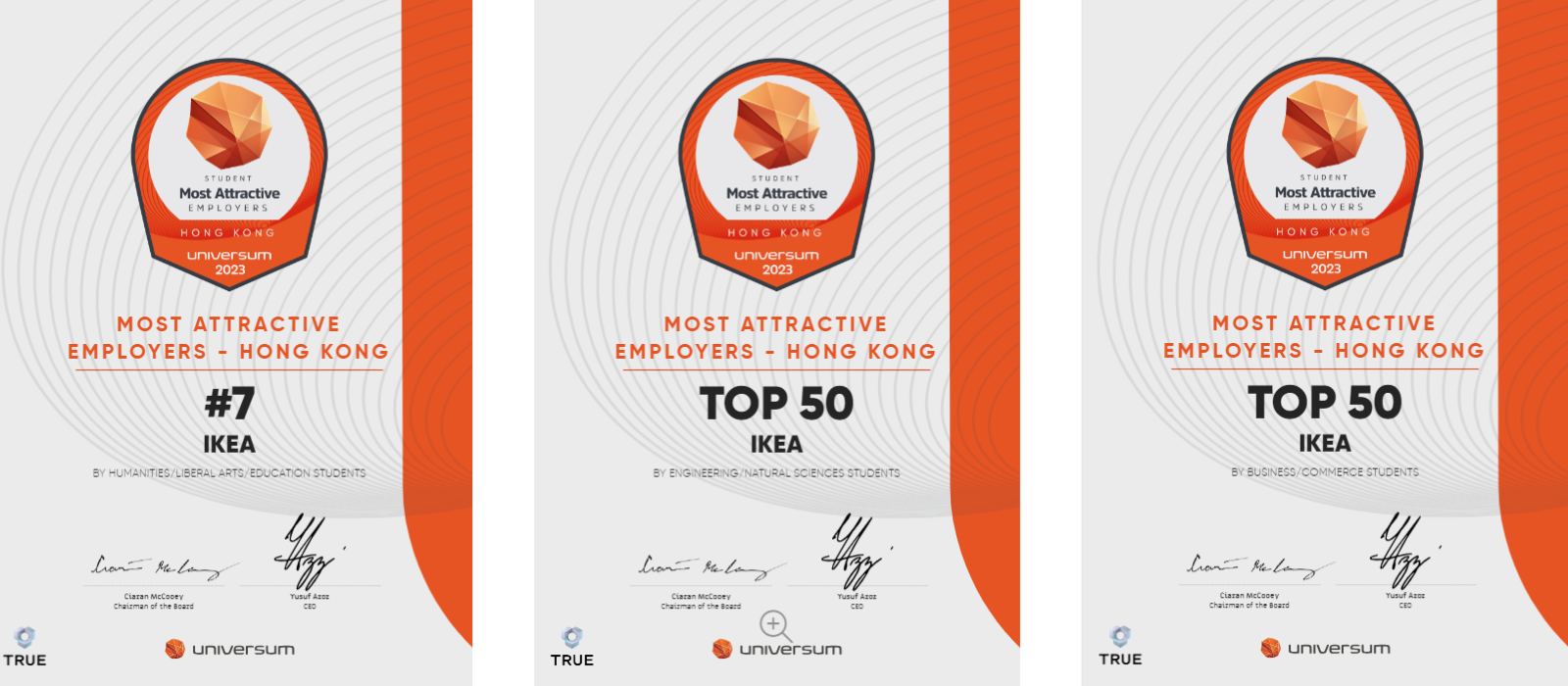 Universum 是一家全球領先的僱主品牌研究機構,每年針對全球學生進行調查,投票選出他們的理想僱主。此排名的調查是在 2022 年 10 月至 2023 年 4 月進行,針對香港 9 所大學內的 4,179 位學生的調查結果。在 2023 年香港最具吸引力僱主排名中,IKEA 在人文/社會科學/教育、工程/自然科學、及商科學生中,分別名列第 7 名、第 19 名、以及第 30 名。