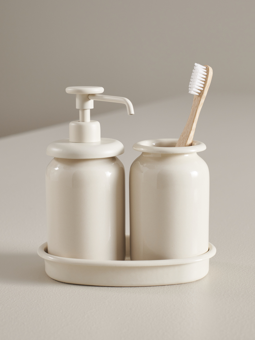 全新的ÅLTJÄRN浴室套裝為浴室注入復古韻味。三件以搪瓷鋼材打造的產品將肥皂、首飾和零碎小物收納整齊,使洗手盆位置顯得更高雅精緻。