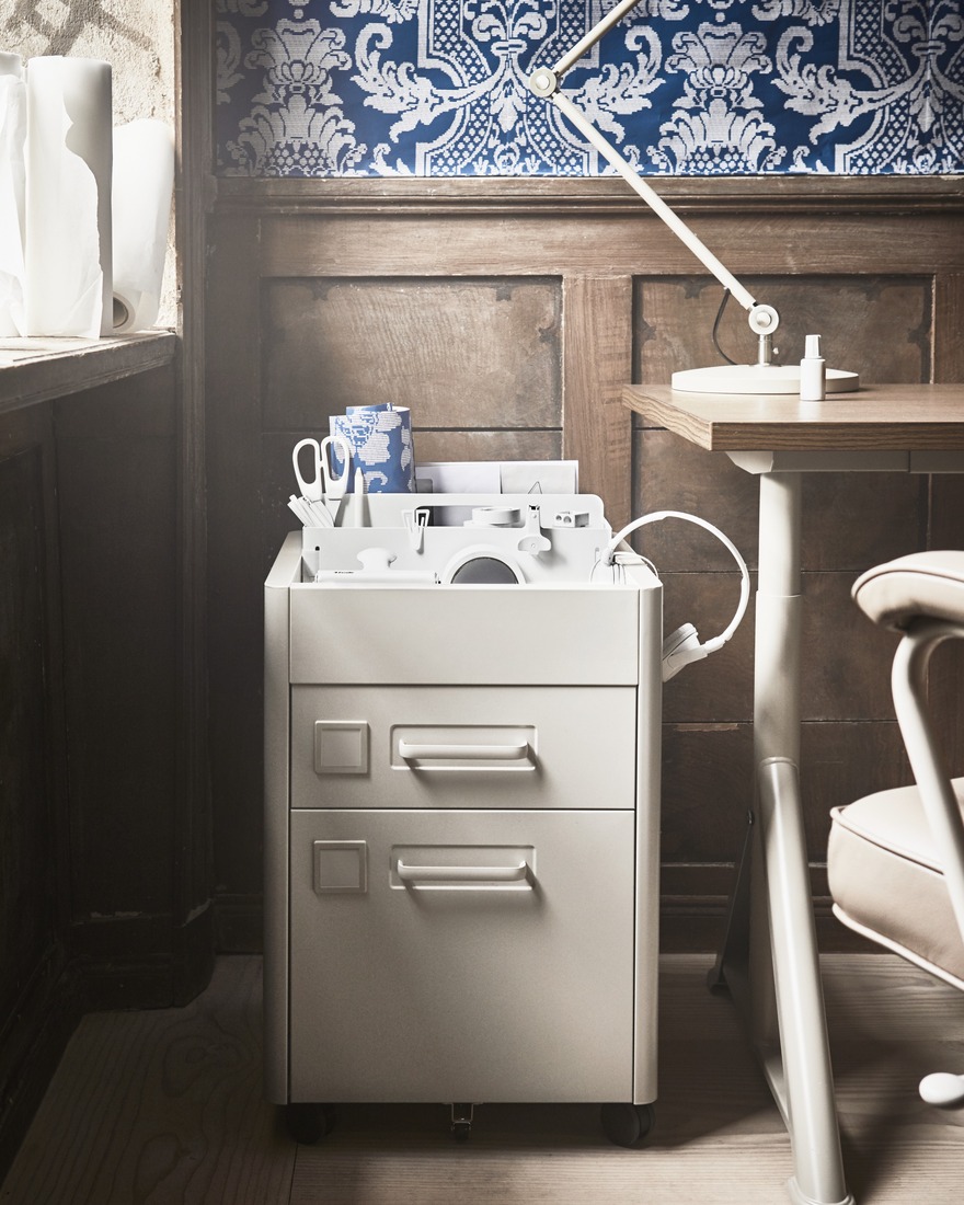 宜家家居隆重呈獻全新IDÅSEN現代辦公室傢具系列,無論是在家工作或身處辦公室,也能讓您感到得心應手。系列備有塗層鋼製貯物組合,設計靈活,並可整齊收納電線,配合無紙時代的潮流。書檯更可調校高度,無論站著或坐下也同樣舒適。只要一按應用程式,書檯便會記下您的喜好設定,讓您輕鬆打造私人辦公空間。