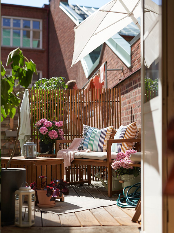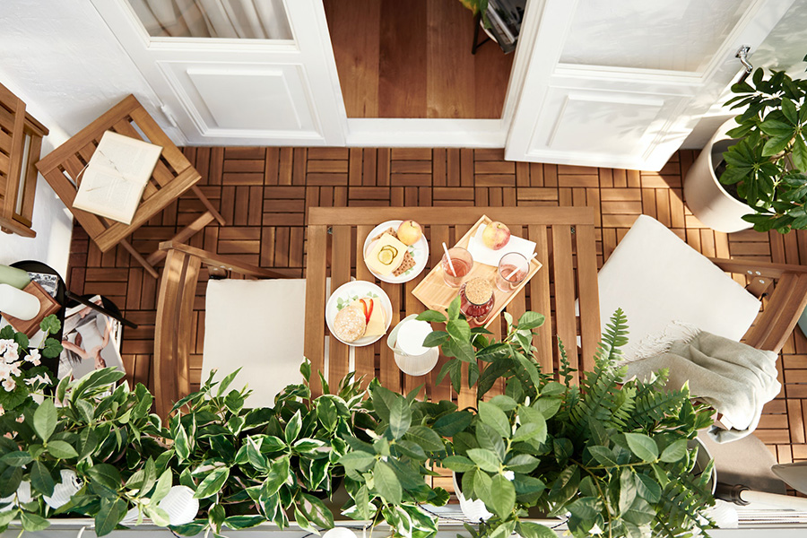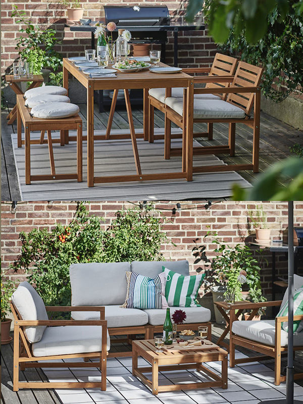 RUNNEN 戶外地板很適合搭配NÄMMARÖ戶外傢具。戶外地板容易拆開及組裝,可立即轉換露台或花園的佈置風格。