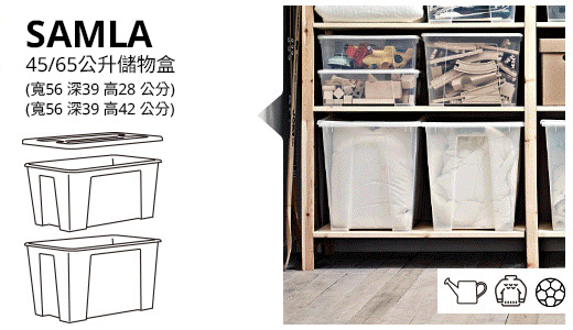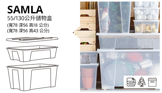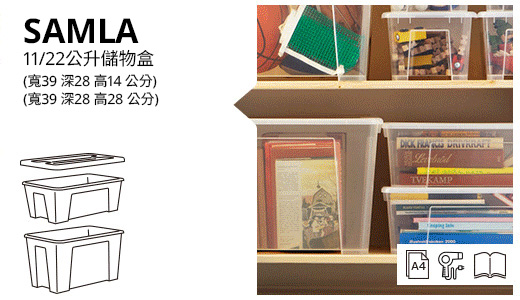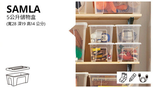 SAMLA連蓋箱適合收納各種物品,而且方便疊起,細箱更可以穩妥地疊在大箱上,節省空間。盒身以透明物料製造,並附有手抽,設計周到。