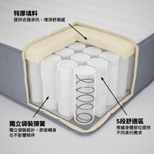 每個彈簧個別受力,轉身時不會影響枕邊人。 泡膠填料和柔軟的彈性織品帶來更舒適的睡眠享受。