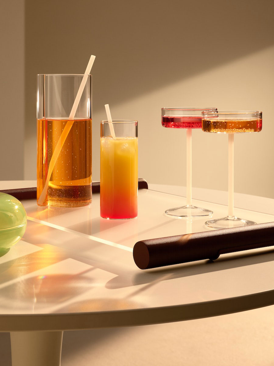 系列包括這套典雅的玻璃雞尾酒套裝,包括附金屬把手的托盤、玻璃水瓶、香檳杯、玻璃杯和攪拌棒。酒具在燈光下反射出夢幻的光芒。