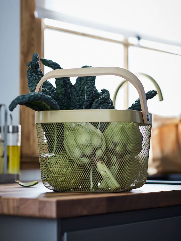 新鮮買回來的蔬果也需要整理,例如儲物籃最適合存放不用放入雪櫃的蔬菜,也為櫃台板增添一點綠意。
