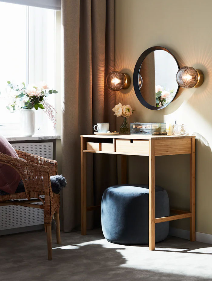 選用竹製枱、精美化妝鏡、舒適座椅和承托雙腳的腳凳,梳妝枱就能兼作放鬆身心的私人角落。記得加上合適的燈具,塑造心儀的效果。