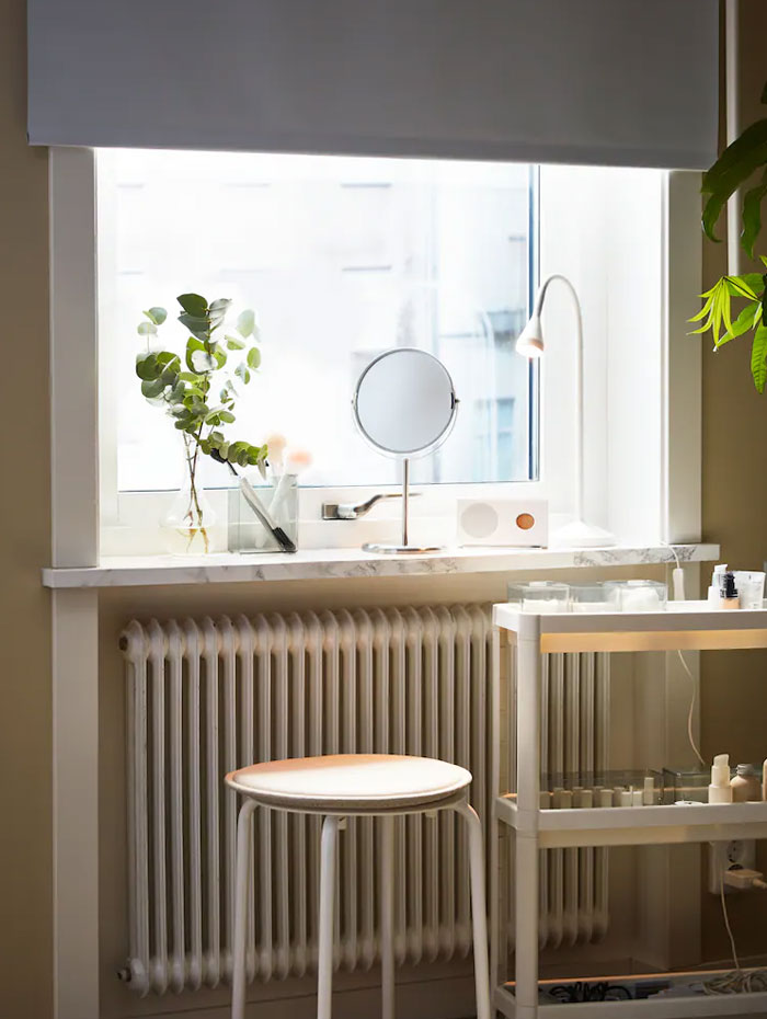 把鏡子放在窗台上,便成為超迷你的梳妝區。你可以在自然光下化妝,亦可添加光線集中的射燈、一面放大鏡和方便移動的活動几。