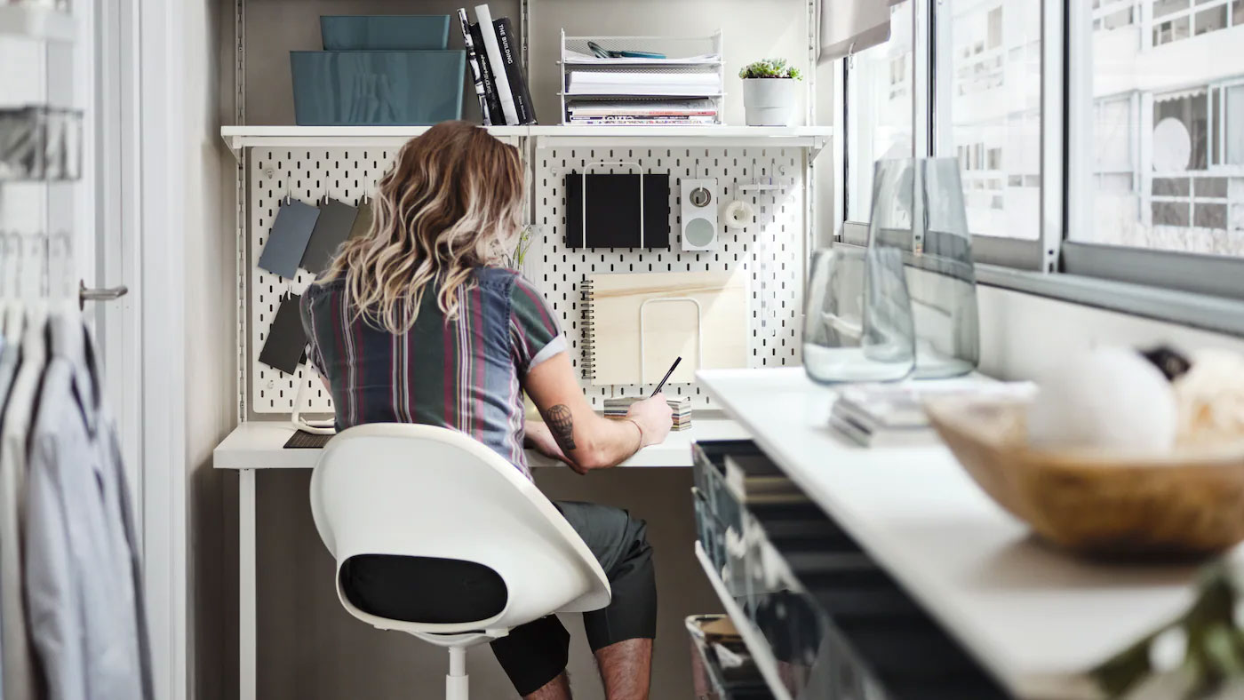 在細小的空間內,必須盡用牆面空間。吊櫃提供大量儲物空間,即使坐在下方的書枱前也能輕易拿取物品,中間的牆壁亦可安裝層板和洞洞板,變成實用儲物組合。