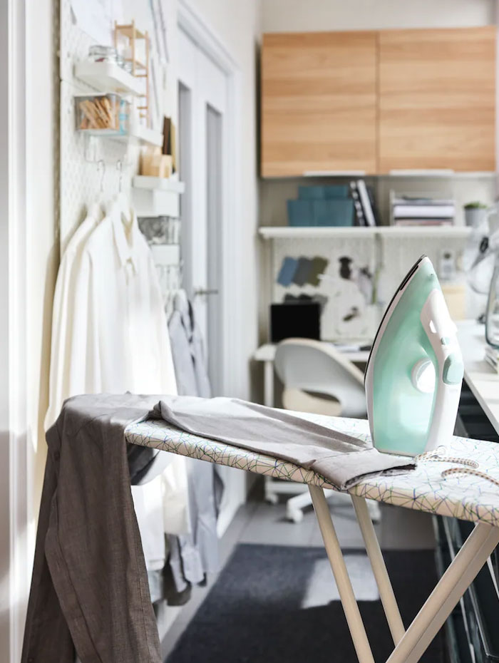 細小的空間也可以非常實用。若想熨衫,隨時也有空位熨衫,而且熨衫板可以收起掛在牆上,幾乎不佔空間。