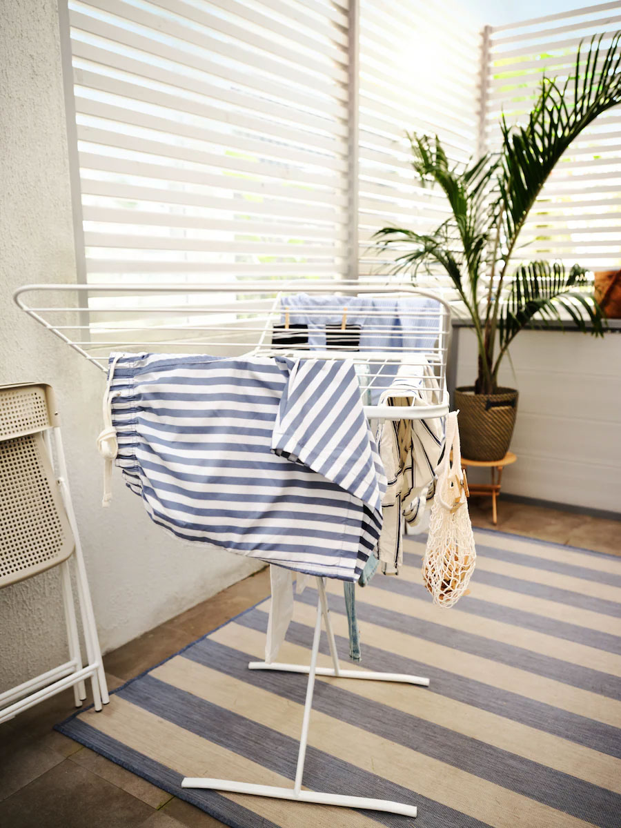 整齊的平台能提供大量空間配合不同需要,例如在戶外晾曬衣物。這款可摺起的曬衣架能快速打開,亦容易收起。