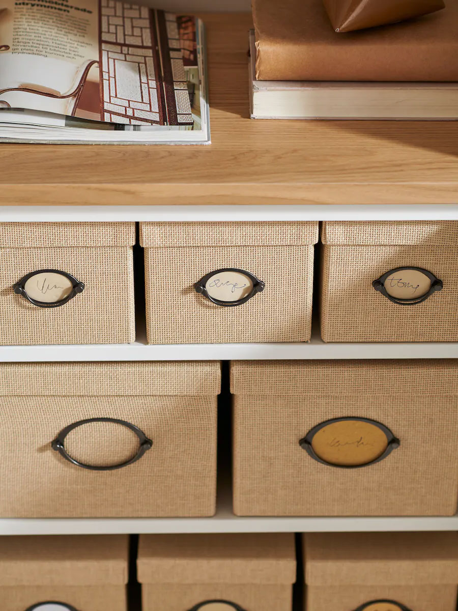 即使儲物盒藏在門後,知道櫃內物品井井有條,也令人心情愉快。堅固的連蓋盒妥善收納物品,而且不會積塵。