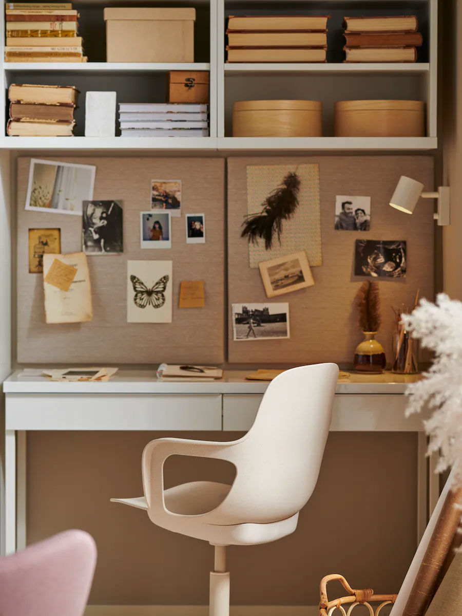 在牆身儲物組合加入一張小書枱,打造迎合需要的工作區。書枱設計慳位,而且能配合整體空間布置的風格,與旁邊的儲物空間相輔相成。