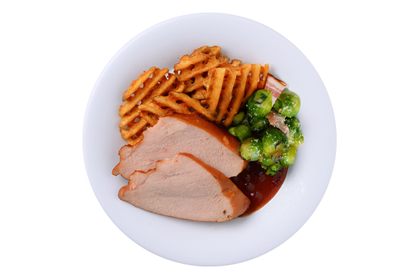 燒火雞配煙肉芝士椰菜仔、薯格及紅果子燒汁