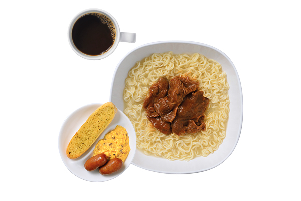 沙嗲牛肉麵、黑松露炒蛋配煙燻蜜糖腸2件、蒜香牛油法包及咖啡/茶/汽水