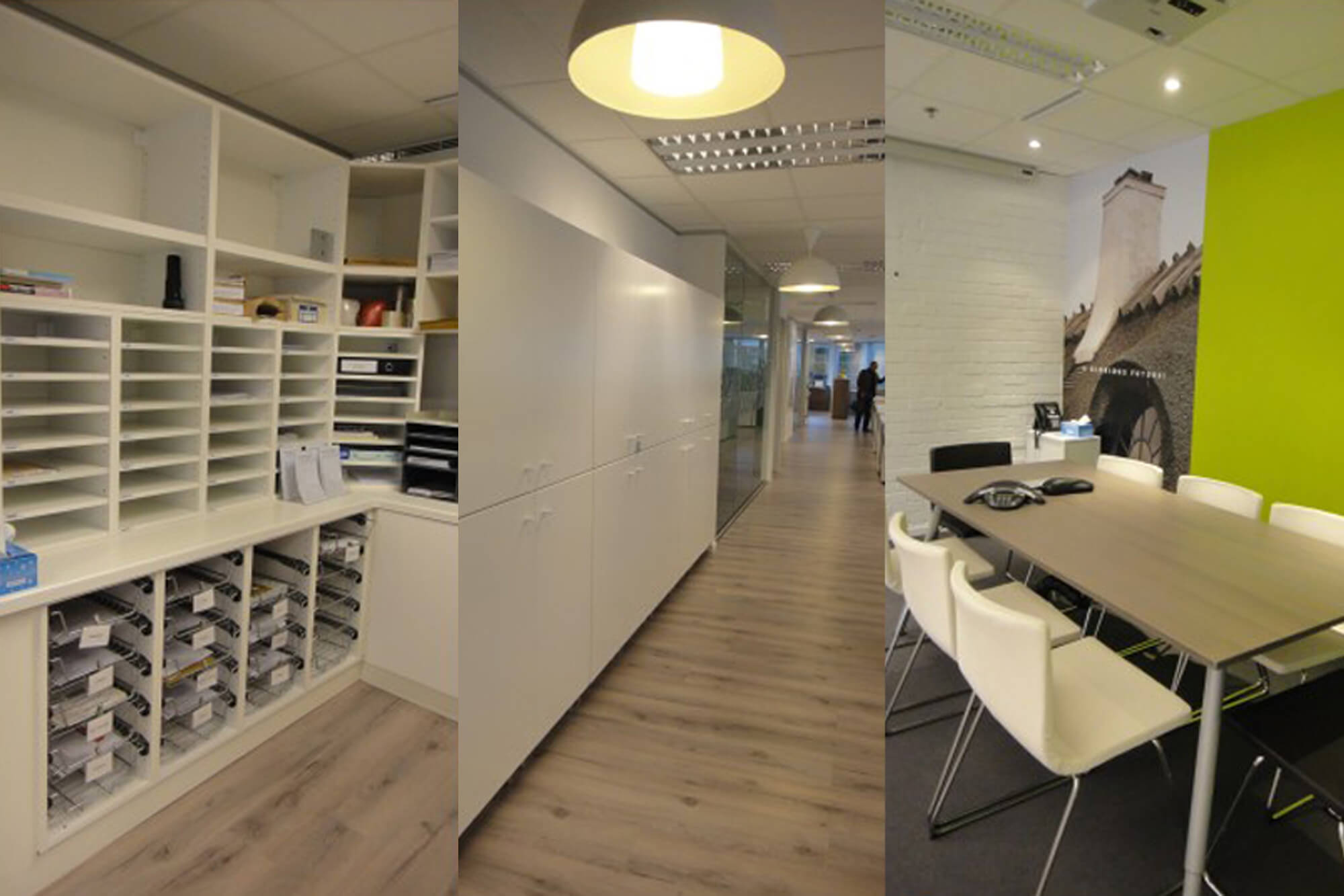開放式寫字樓是現今常用的辦公室設計方案;除了令空間感更大,亦帶來整齊、 簡約的感覺。想為辦公室變得更有個性,我們使用了北歐風格的傢具,既為辦公室增添一份溫暖,但又不失專業性。 沒有大型屏風作間隔,使員工之間能更互動工作。會議室增添了一幅裝飾牆,改善了原本既沉悶又單調的空間,再加上綠色盆栽更增添生氣。