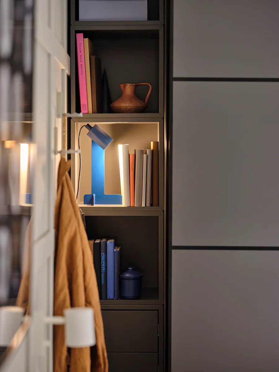在灰色色調疊層的睡房裡,藍色的桌子和檯燈能為房間注入活力,搭配小配件與書本,更是大大提升現代感。輕巧靈活的床邊桌如同生活的小助手,無論到房間哪個角落都能隨時候命。