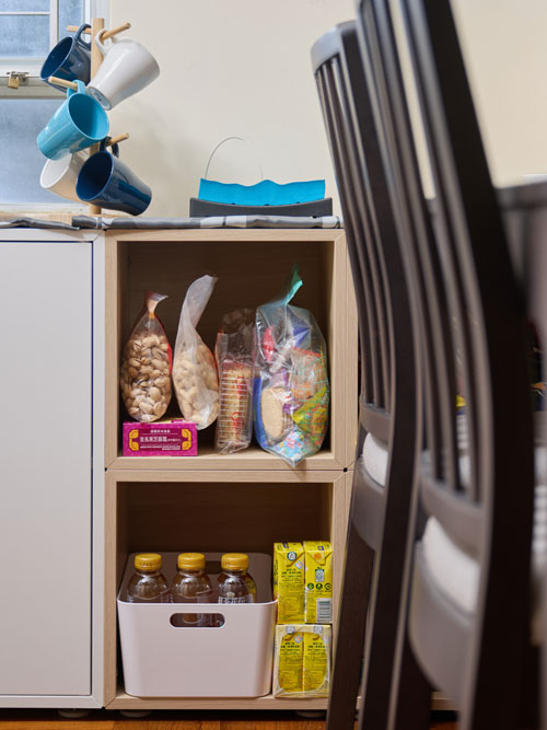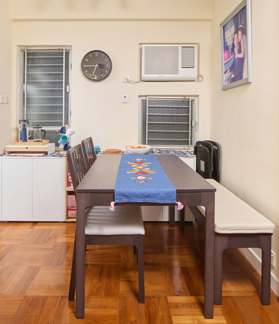 於客飯廳擺放各組不同收納櫃,整齊分類不同物品,建立有系統的環境。特別挑選木色傢具,配合單位原有的木系裝潢,令整體布置更和諧。