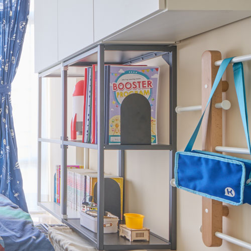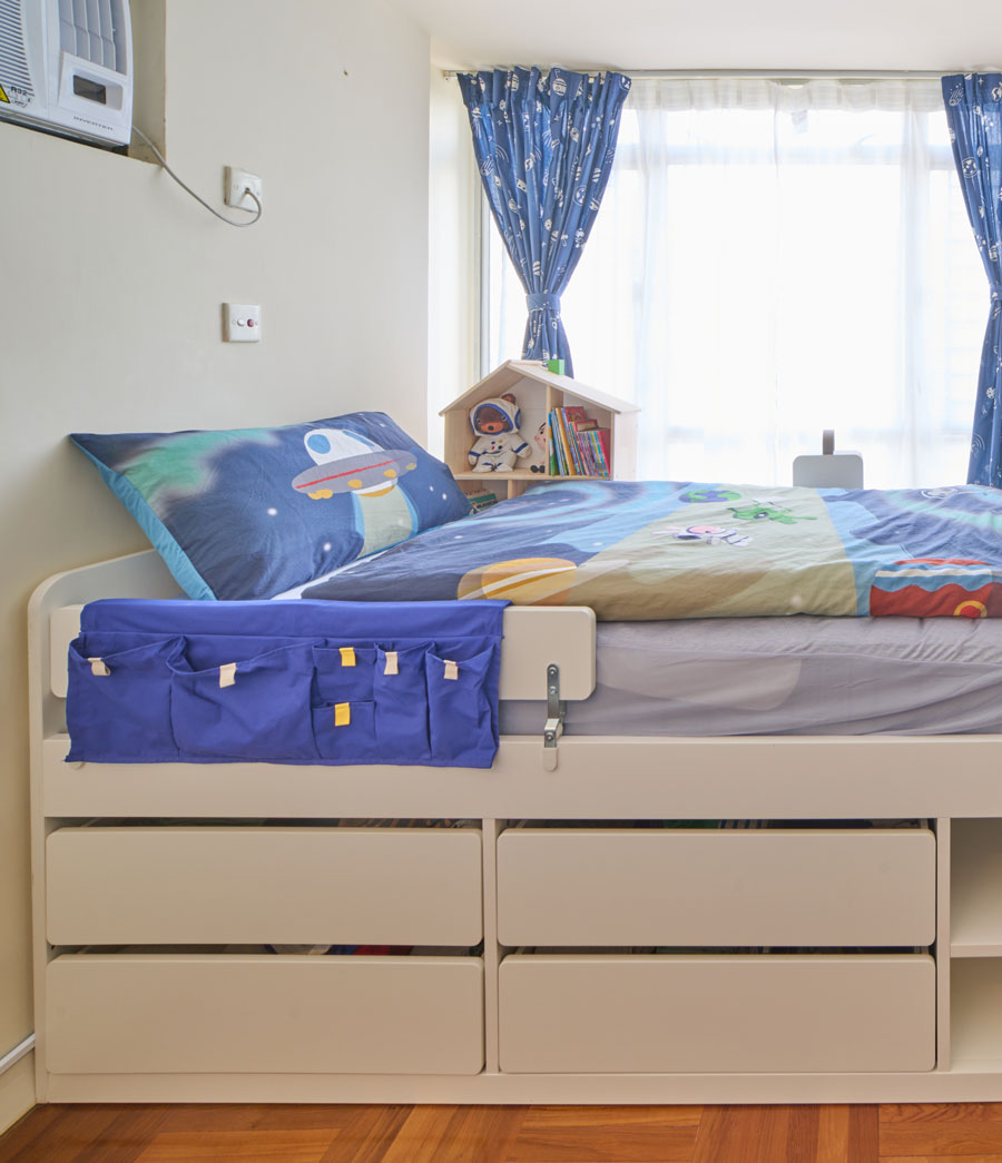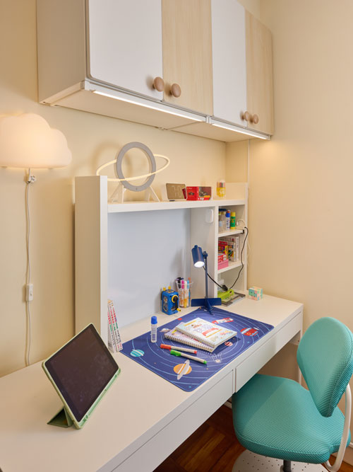 兒子逐漸成長,希望擁有更多個人空間閱讀和玩耍。一個專屬的空間能改善兒子的專注力和培養獨立能力,房內的大書檯讓父母可以一起與兒子學習。