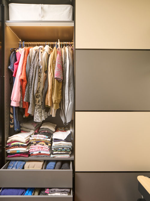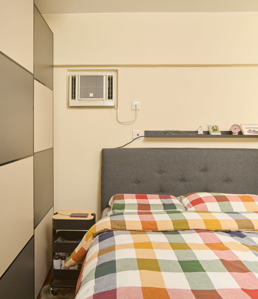 於主人房添置趟門衣櫃,節省空間同時可容納大量衣物,配合不同的收納配件整齊分類衣物,方便拿取和整理。