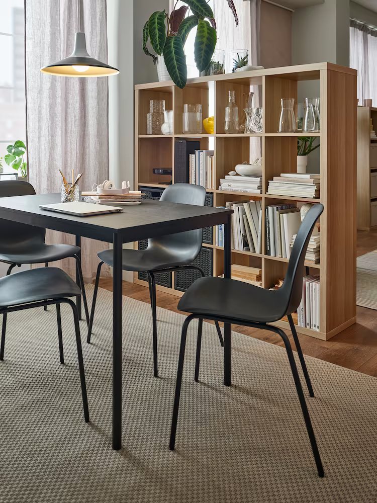 使用層架為分隔線,便能在一個房間打造兩個空間。這款現代風的透明層架除了能製造空間感,也能擺放書本、裝飾品和植物,讓空間更加個人化。多款黑色籃子能儲起雜物,使餐廳煥然一新。