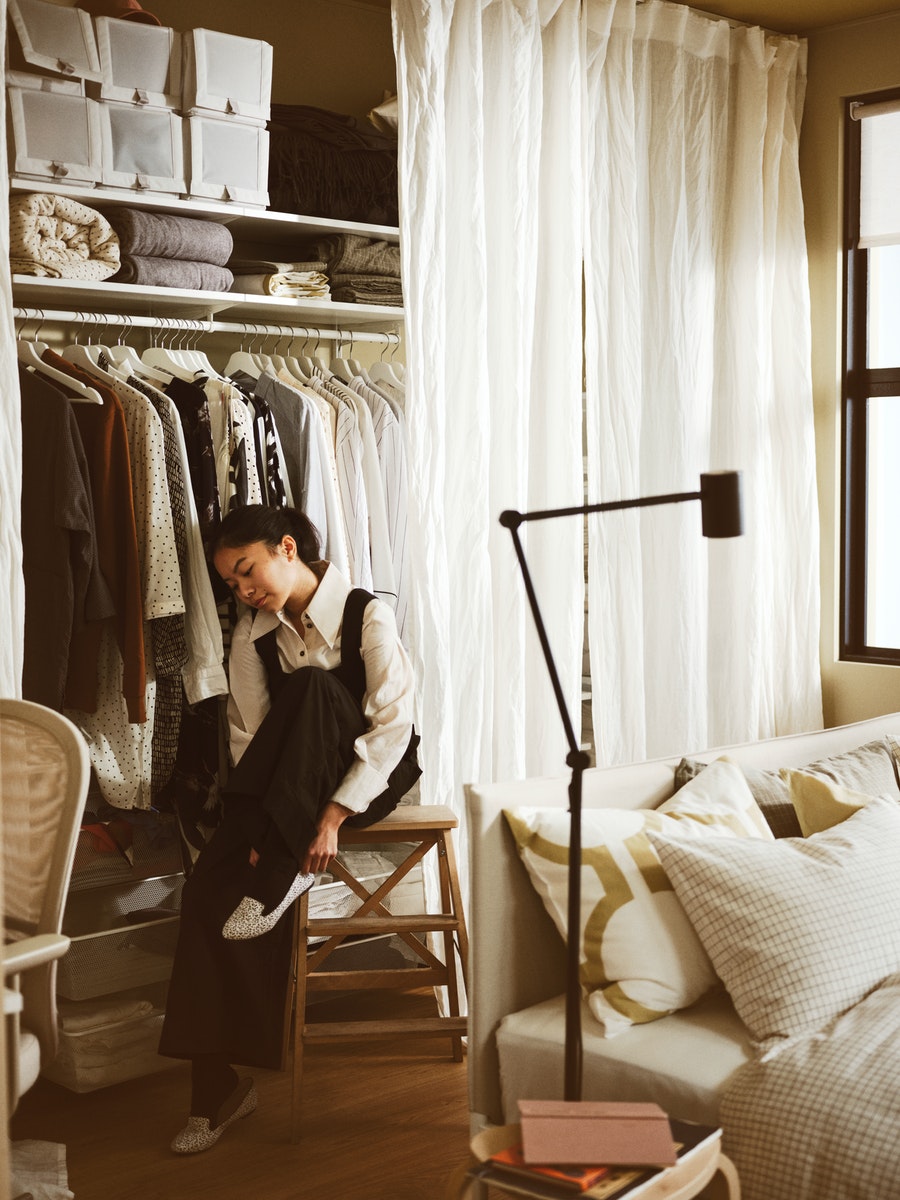 甫踏進他們的睡房,一張簡約的睡床立即映入眼簾。睡房只有三面牆,騰出空間擺放其他物品,而床後亦有一條通道,只要拉開布簾,便是井井有條的衣帽間。