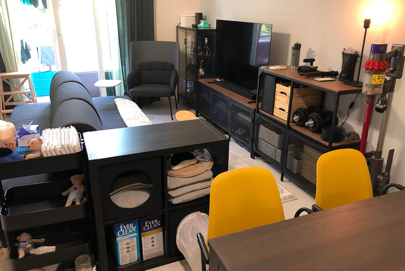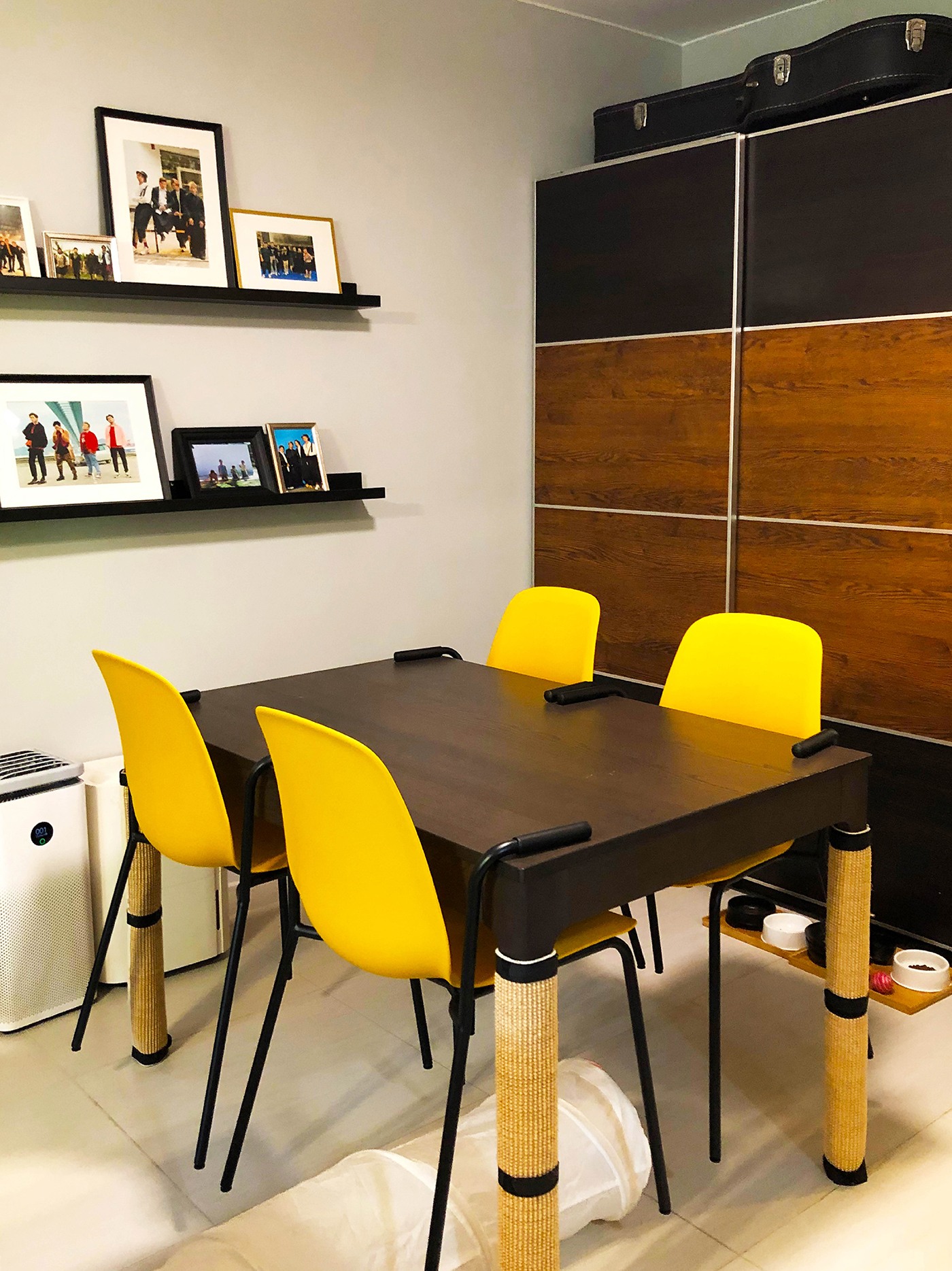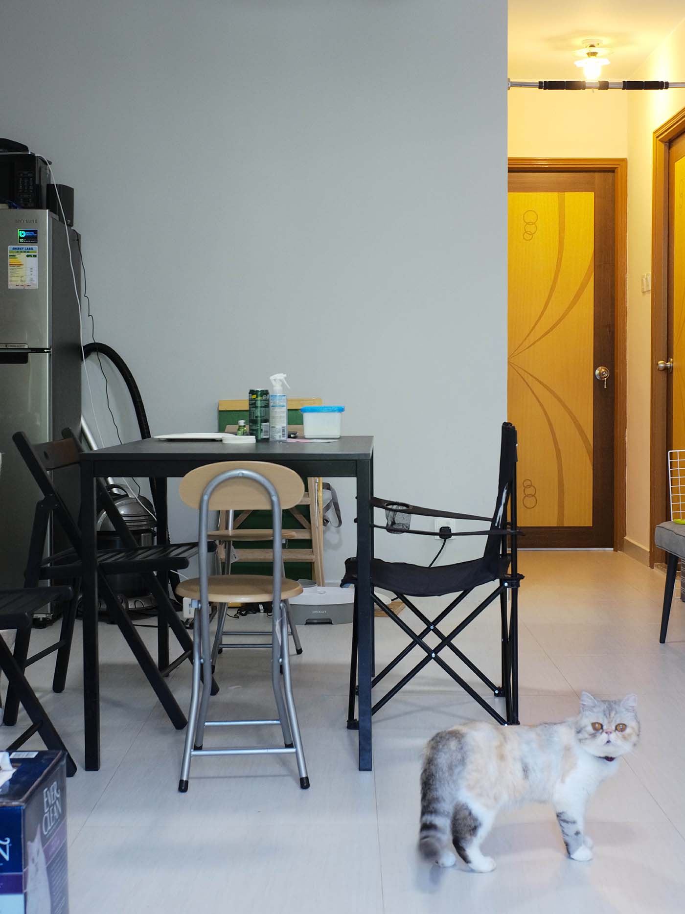 不想餐檯損耗太快?加上貓抓墊能保護檯腳更可將其變成抓柱,方便貓貓磨爪伸展。連扶手餐椅可掛在檯面上,方便清潔地面。大型物品如吸塵機、打印機及額外的櫈等都可統統被收在大貯物櫃內,收起雜亂,讓空間更整潔易打理。
