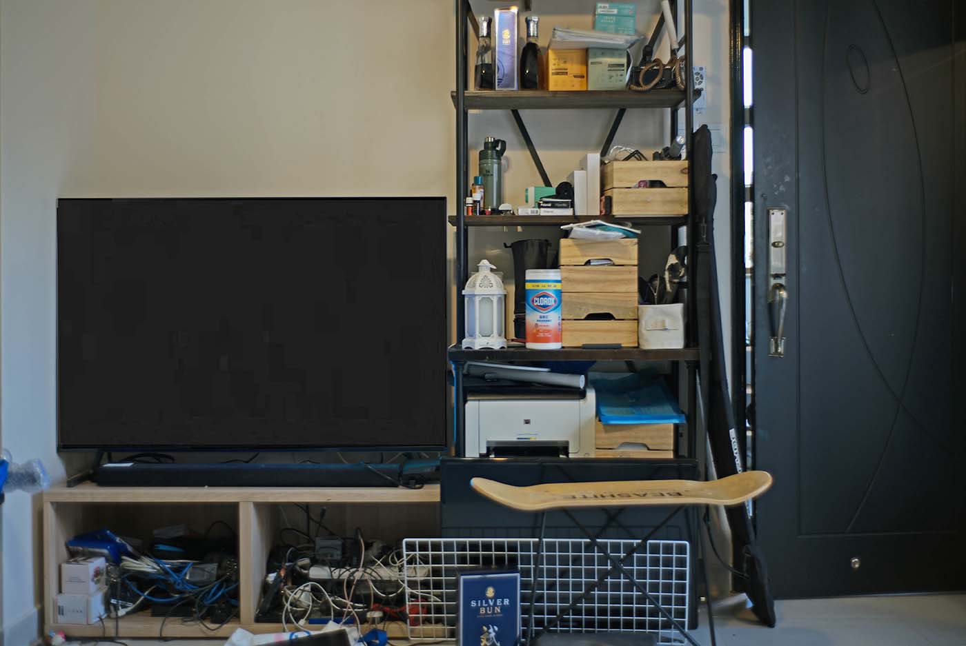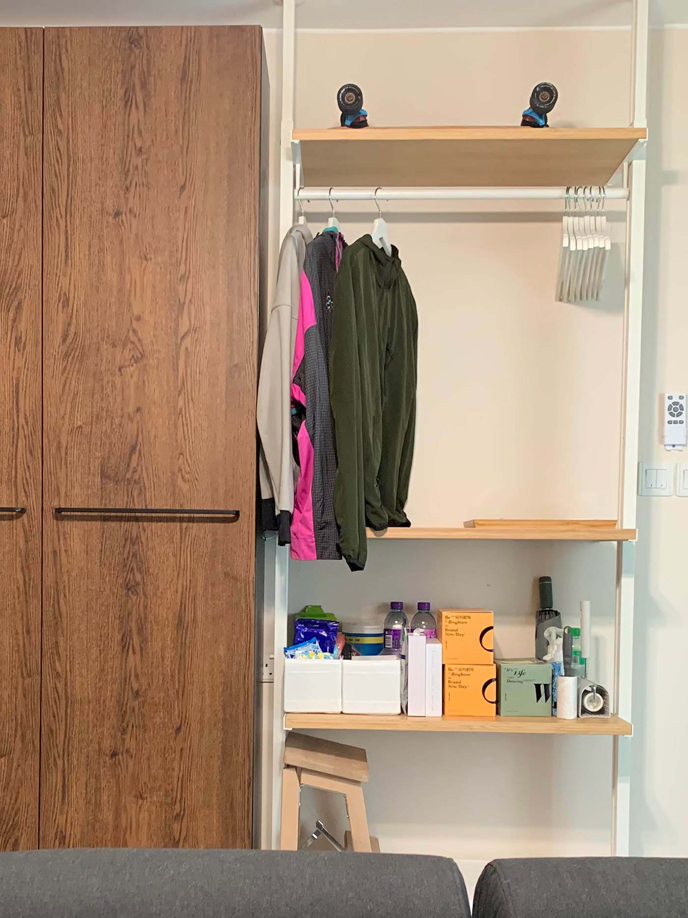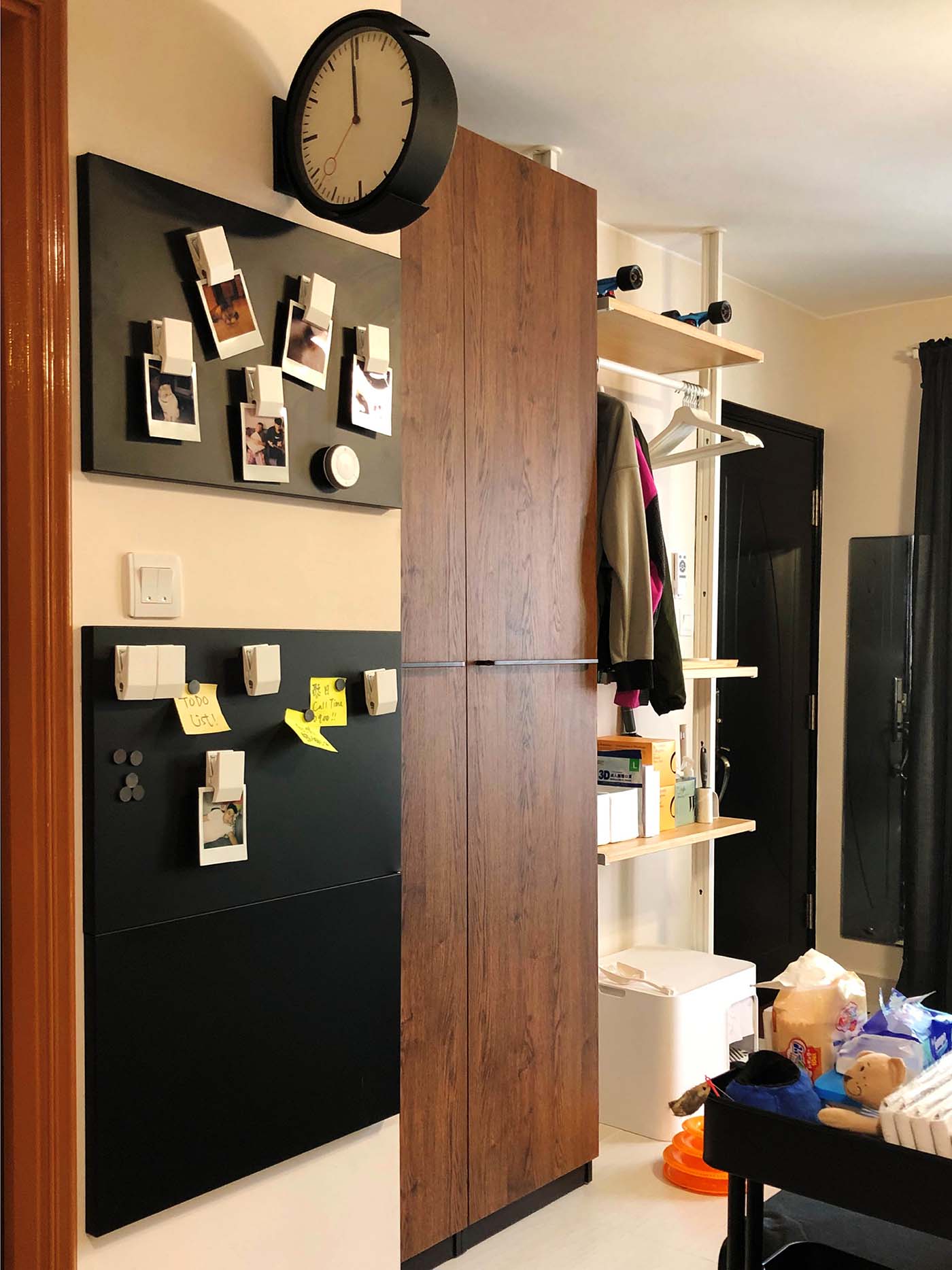 面對抗疫新常態,可於大門口設置開放式衣物架讓衣物消毒通風,並加置層板擺放口罩、消毒洗手液或鎖匙等隨身出門物品,底部位置更可預留空間擺放大件的貓廁所或摺踏梯。衣物架旁設有特大鞋櫃以存放三人份量的鞋。而大告示板則可幫助善忘的屋主記下不同要事,作為出門前的最後提醒。