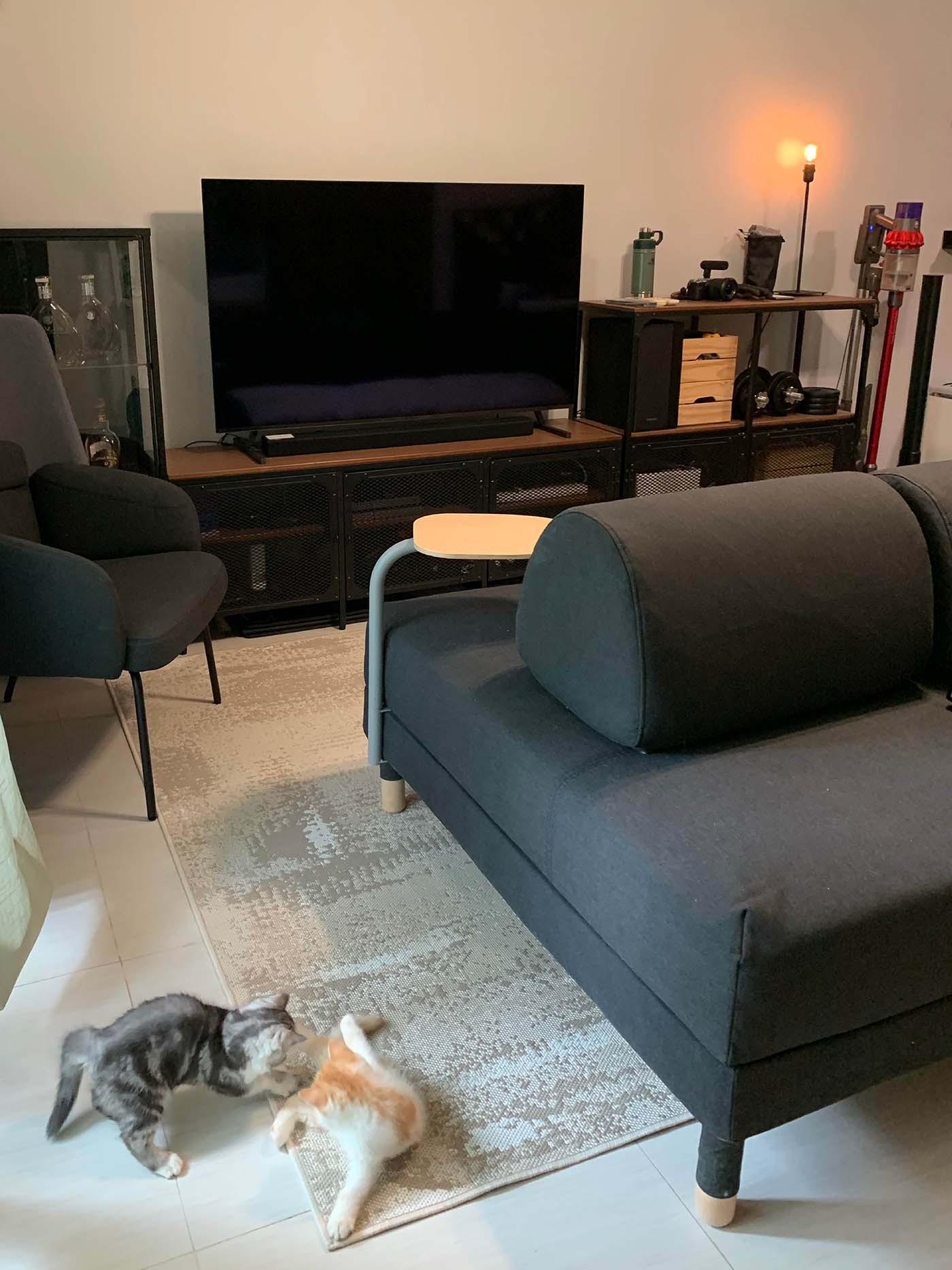 無論看電視、招呼朋友、與貓貓玩耍或睡覺,梳化都有足夠空間。輕鬆移動背墊更可應付不同需要而同樣舒適。電視貯物櫃採用金屬網門設計,即使隔著門,電子器材也能接收到遙控器訊號,又不怕貓貓把玩電線。為了給貓貓更多專屬空間,設計師將四格貯物櫃與手推車改造成貓屋,讓貓貓放心住開心玩。客飯廳均採用深木色系的傢俬以營造型格的工業風。