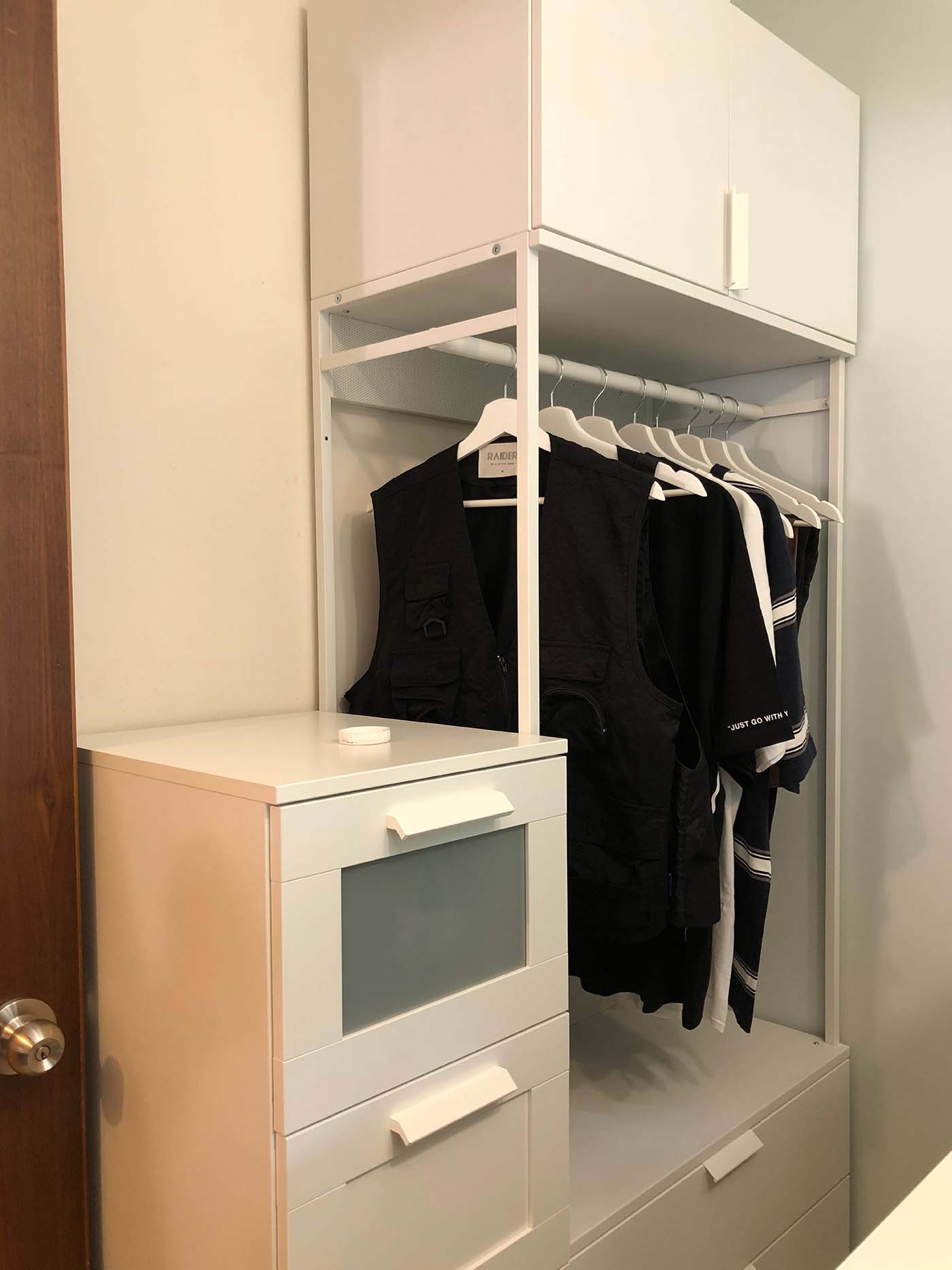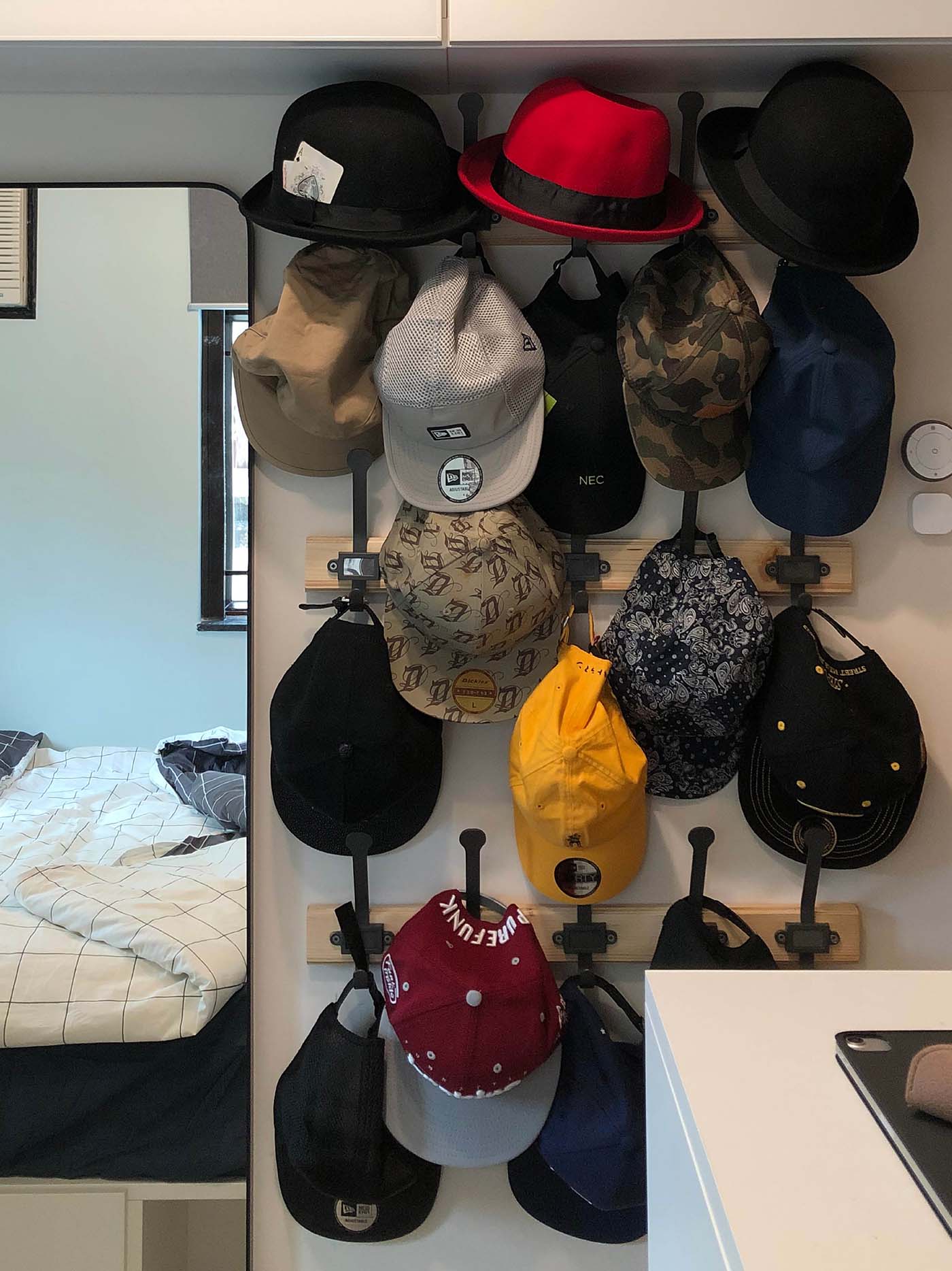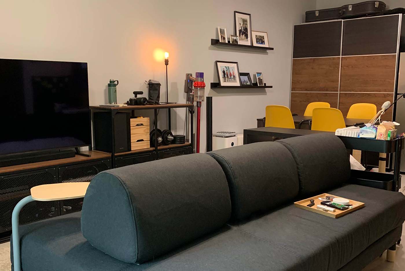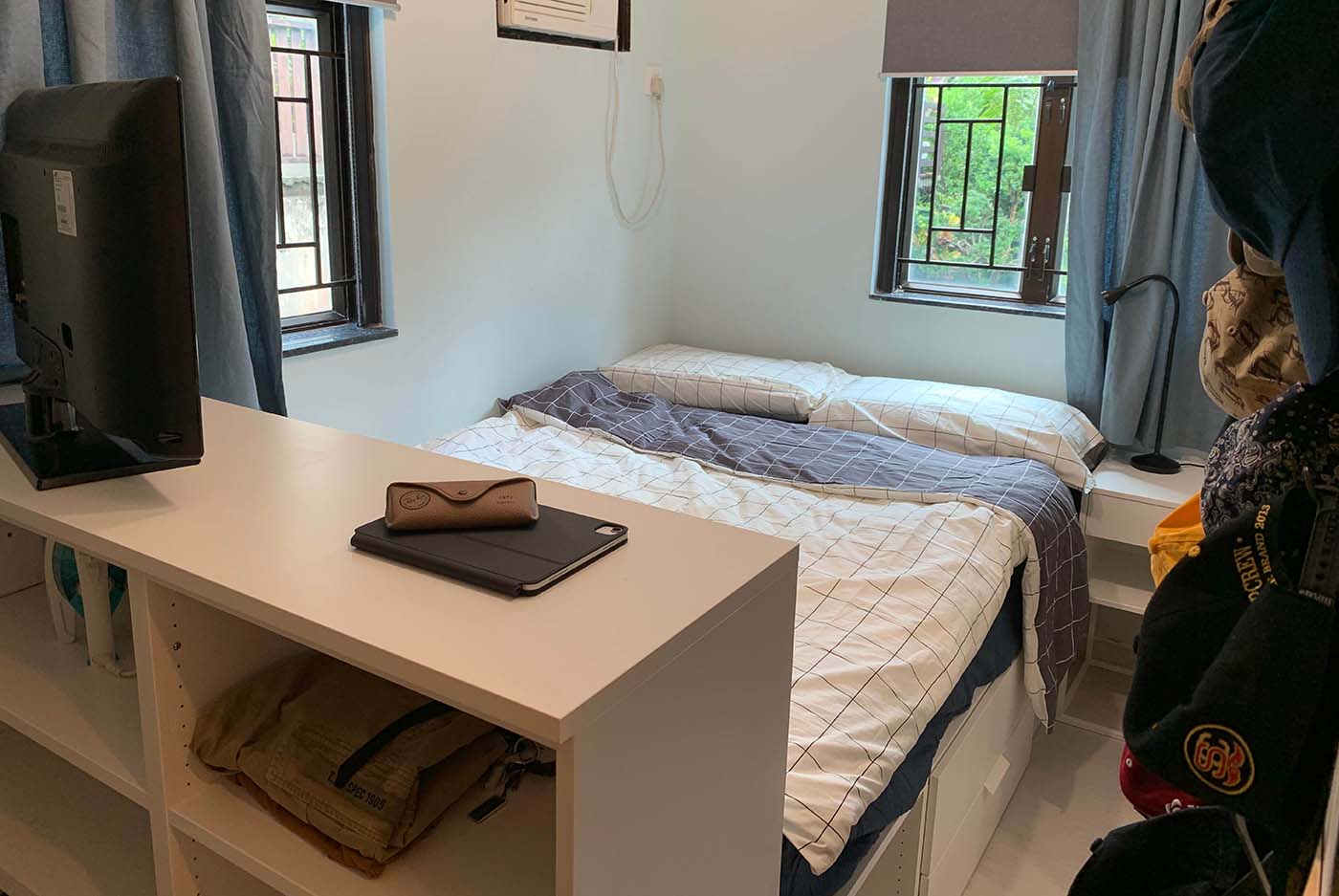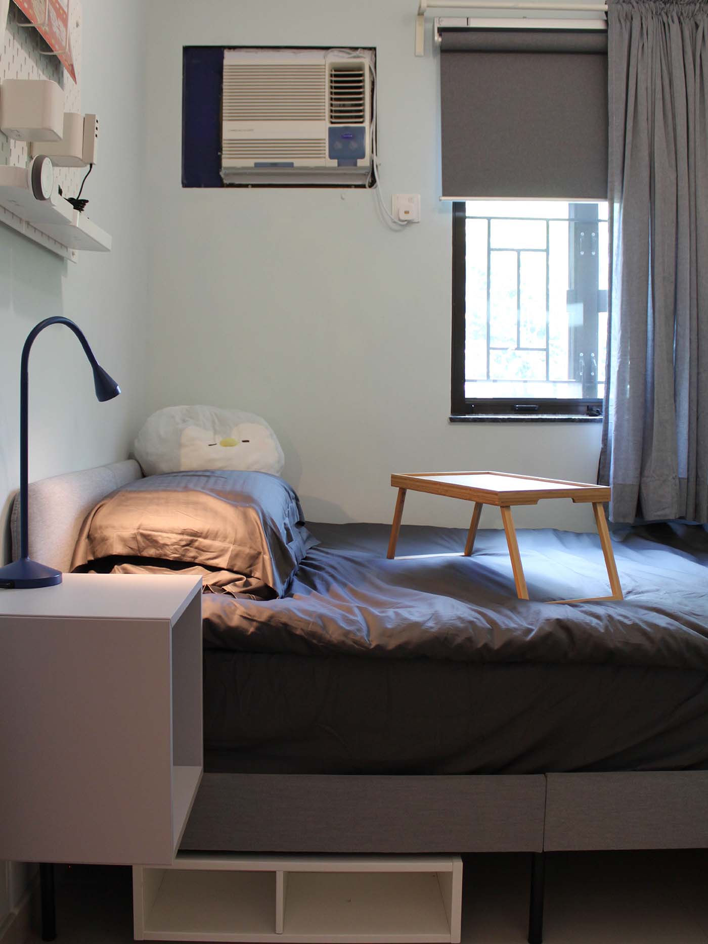 瞓覺達人希望躺在舒適的睡床上便能做到所有事,所以於床頭位置添置床頭櫃及洞洞板安放紙巾、護膚品、叉電線等日用品,舉起手即可拿到。另外,房間使用了智能燈飾及智能捲軸簾,加上TRÅDFRI閘道器便可透過手機或平板電腦利用IKEA Home smart應用程式來控制智能裝置,非常容易。