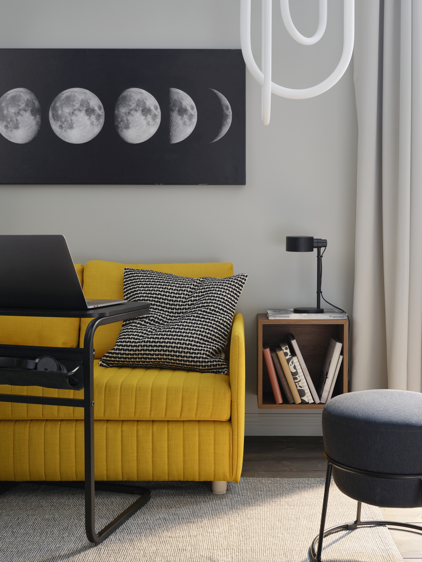 花點心思在電競房劃出一個舒適角落,即使客人只是從旁觀戰,也能樂在其中。放些咕𠱸、腳凳和電腦檯/角几,便能隨時招呼客人。配搭簡潔俐落的FRIDHULT梳化床和棉質地氈,便能在決戰大魔王前養精蓄銳、好好休息。你亦可以在電競檯上方加裝EKET儲物櫃,令房間回復秩序,亦可用作角几或客人的床頭櫃。