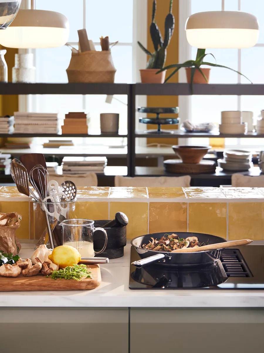 看看這個家庭廚房的細節,拉開抽屜,便有存放香料和調味料的空間。內置抽油煙機的電磁爐和平底護,加上坐在旁邊的家人,讓你能一邊烹調美食,一邊享受天倫之樂,真正一心多用。